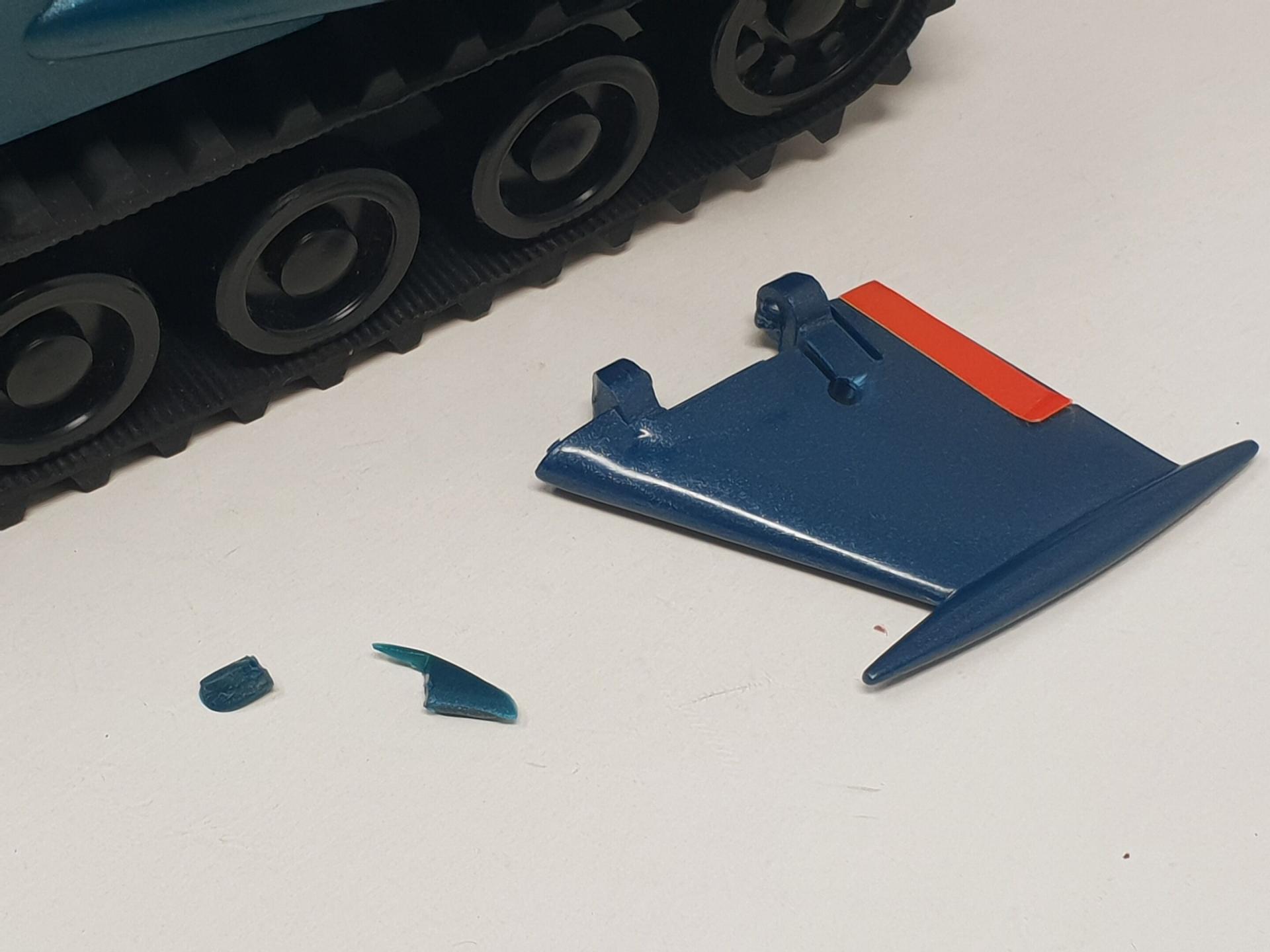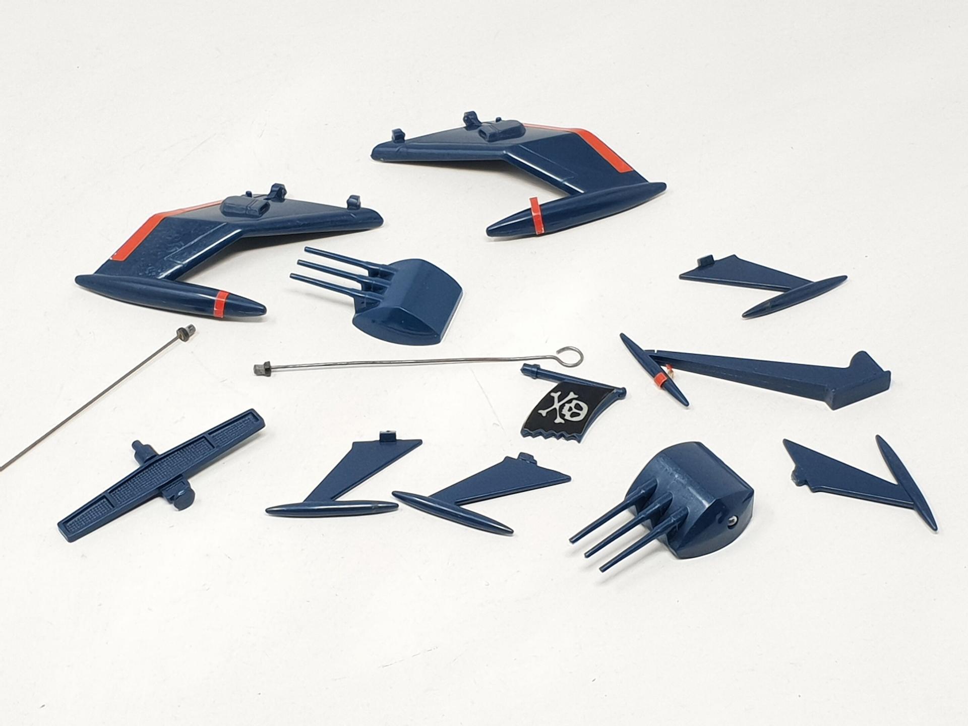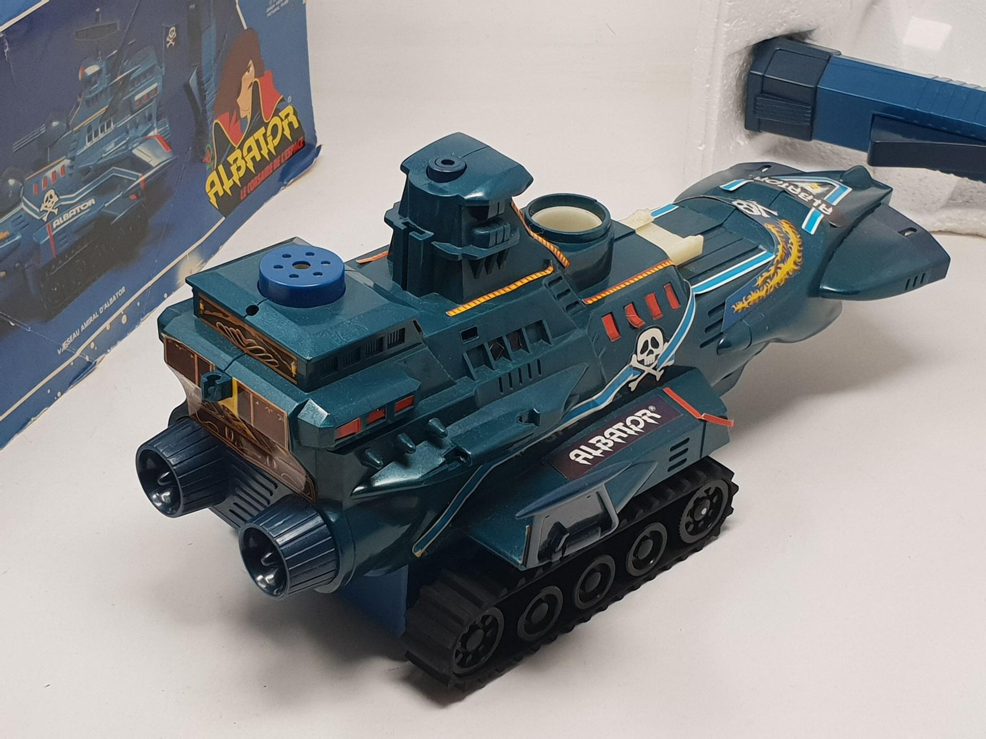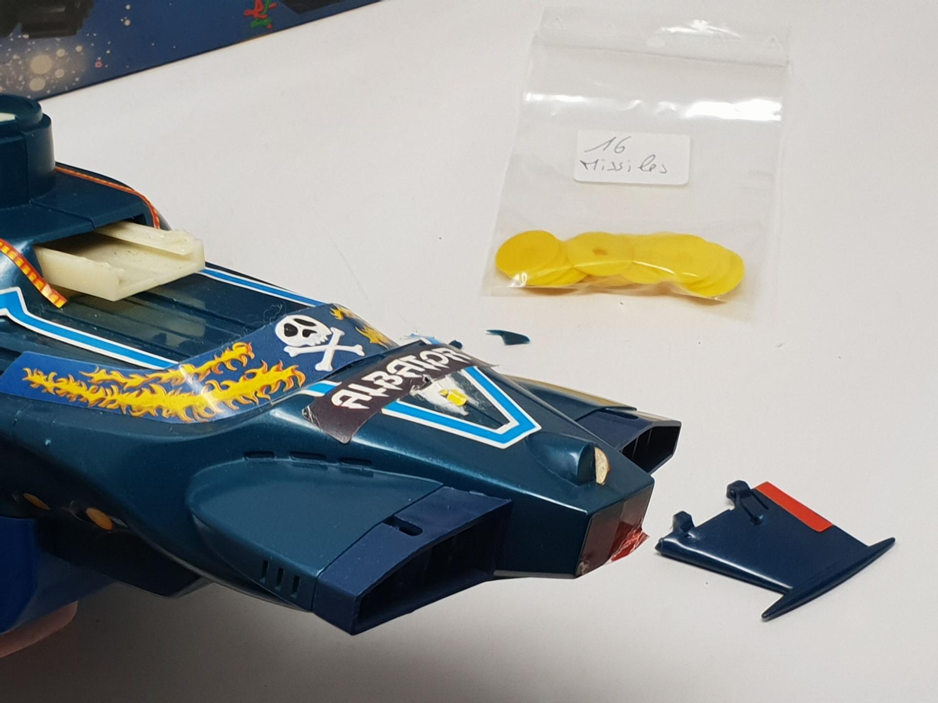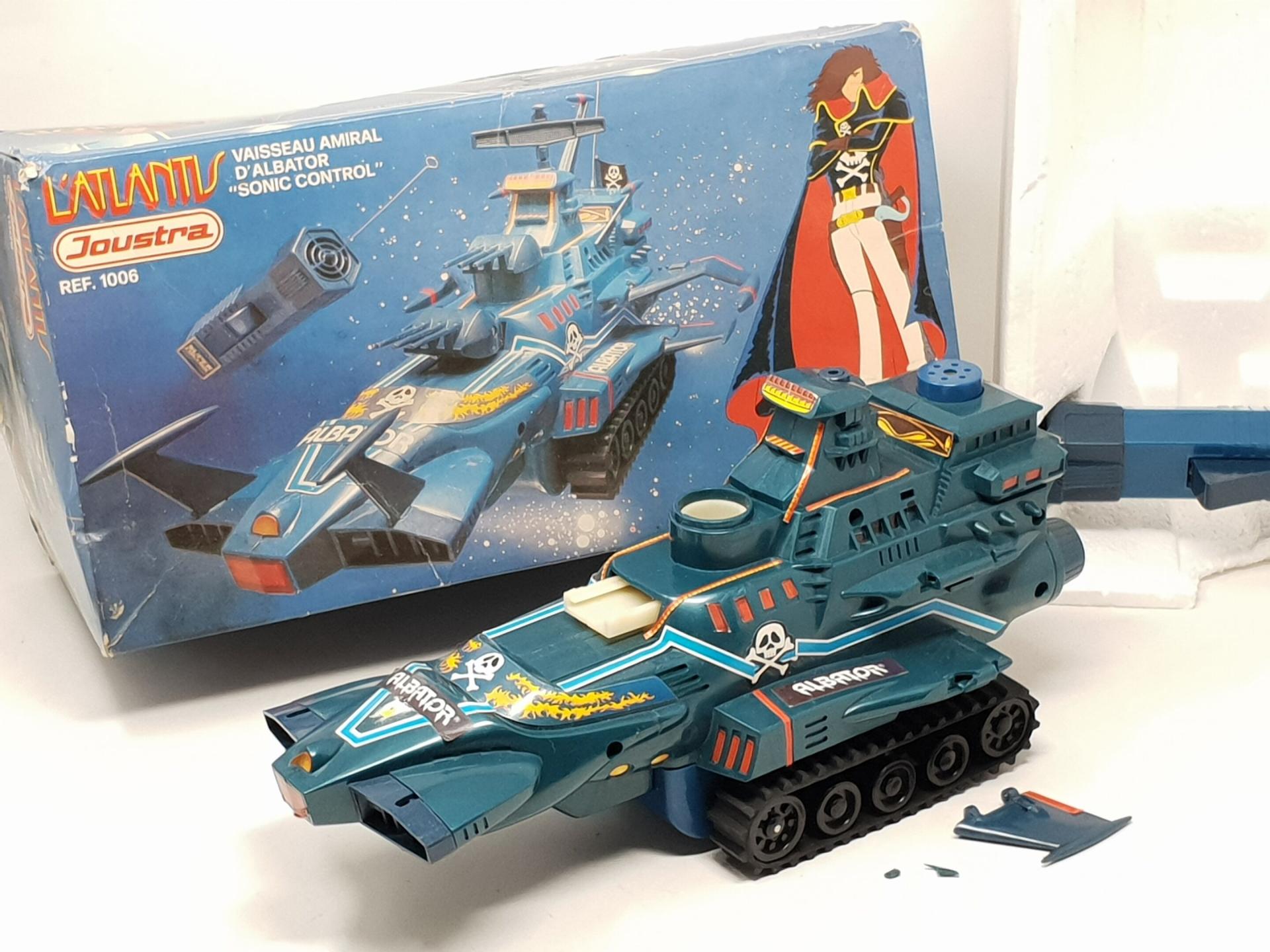 ALBATOR Le Corsaire de l'Espace, Made in France par JOUSTRA : char-vaisseau L'ATLANTIS , électrique à piles (contacts oxydés), L : 31 cm, complet de ses 16 missiles disquoïdes, des ses accessoires amovibles et de son boitier de contrôle (non-testé) - C8 - B7 (un collage à prevoir sur l'aileron pliable gauche) - rare pièce