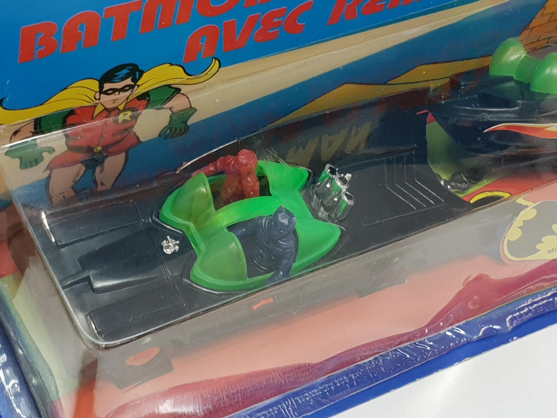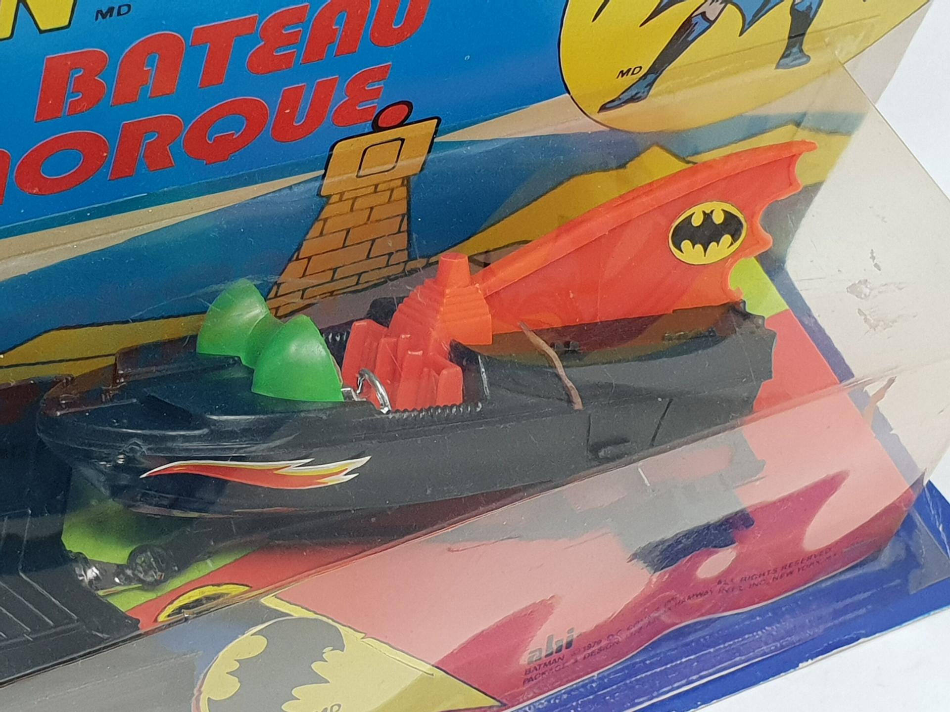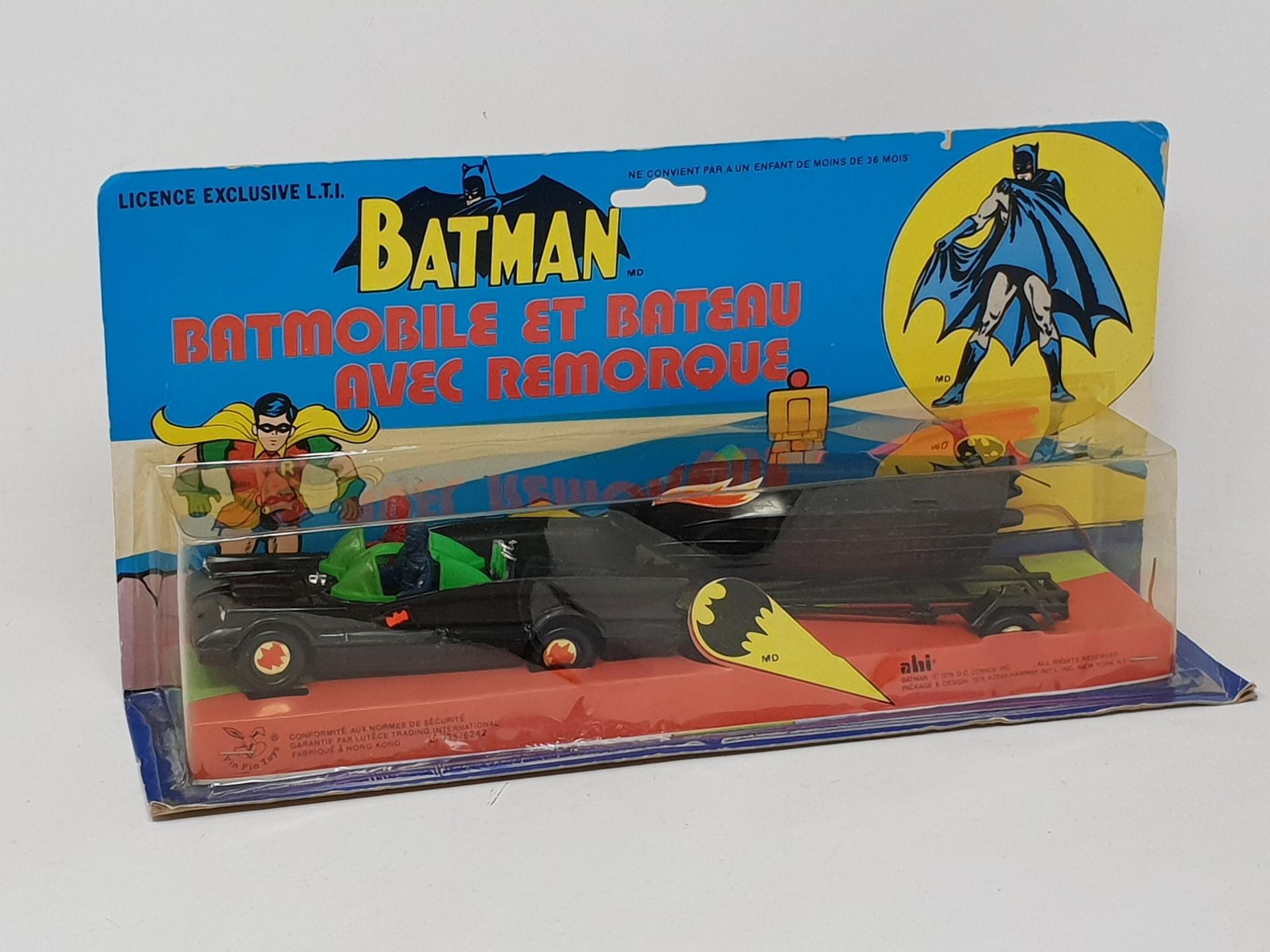 BATMAN - Batmobile en plastique tractant le batbateau, Made in Hong Kong par AZRAK HAMWAY NEW YORK, en blister français 1979 L : 31 cm, C10 - B8