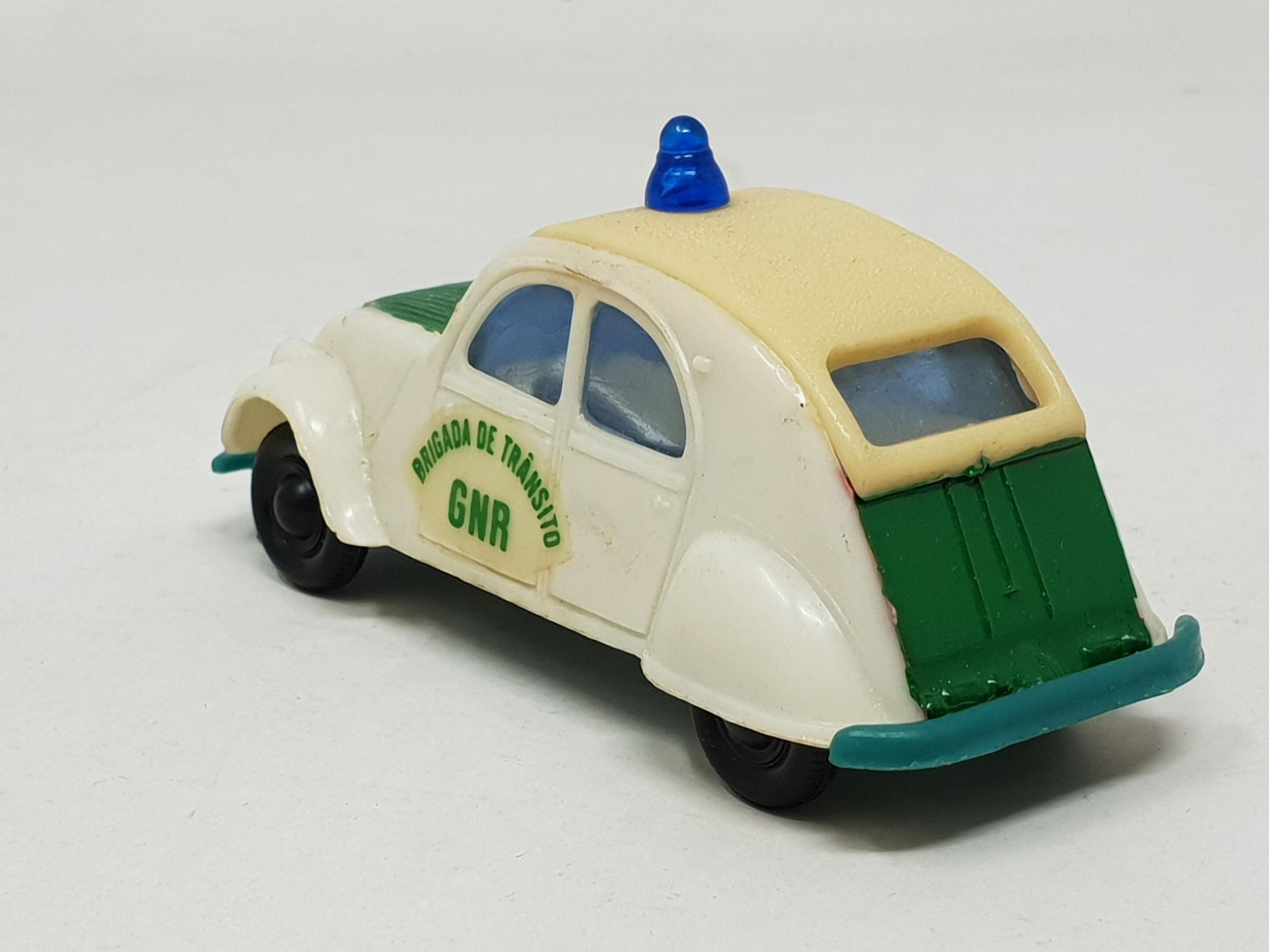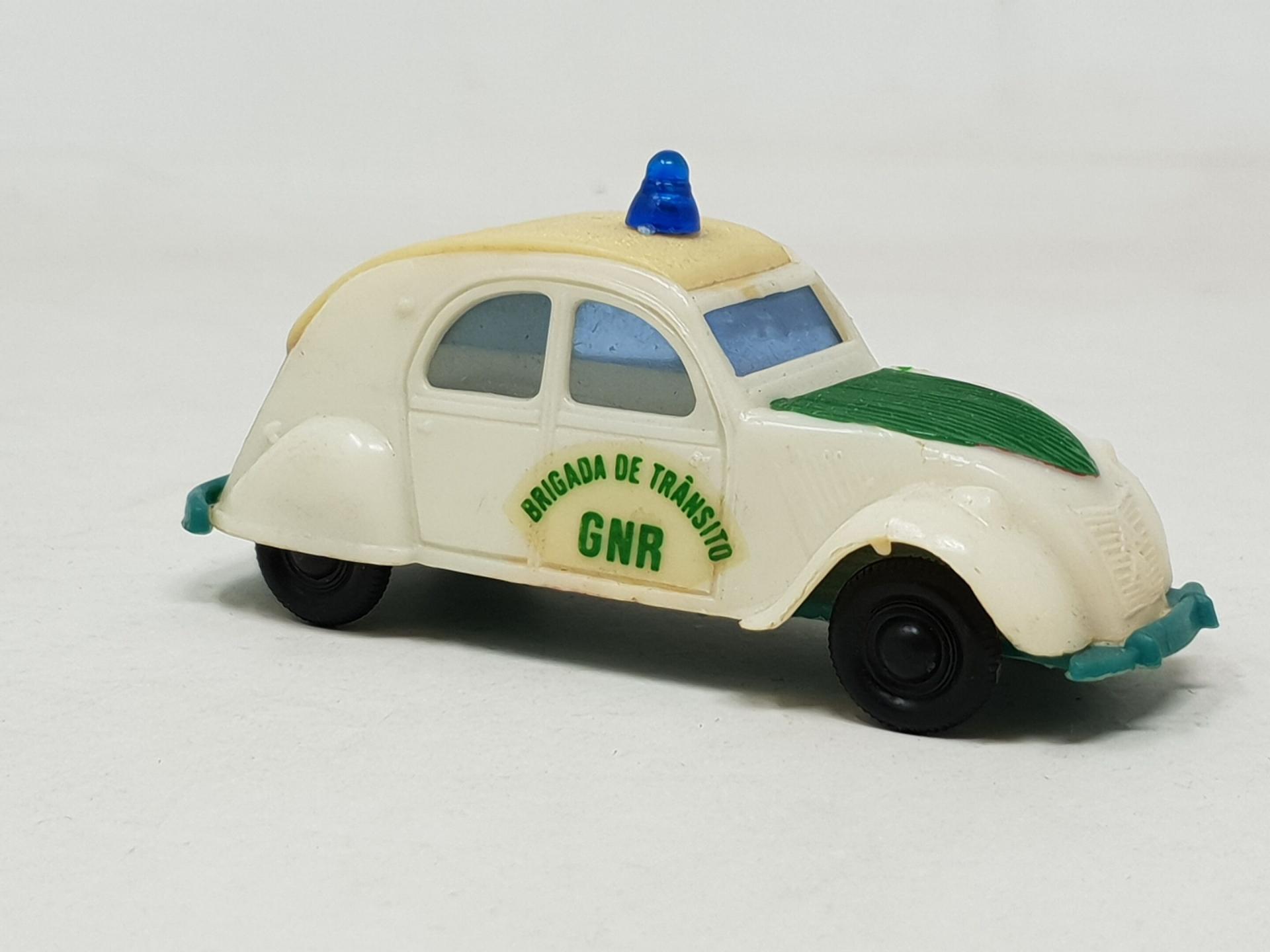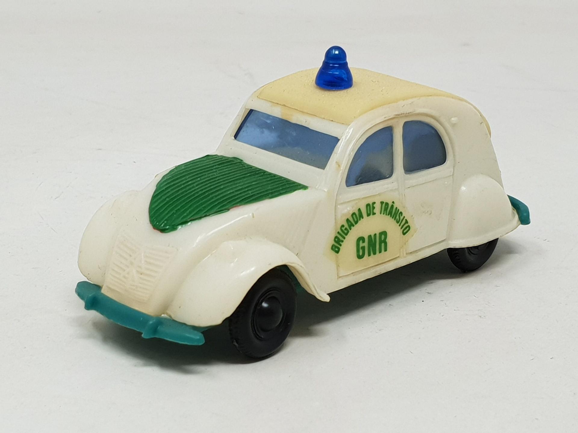 PLASTICS RADAR (Portugal, dans le goût de Clé) Citroën 2cv berline vitrée "BRIGADA DE TRANSITO - GNR" (voiture des douanes, éch 1/48ème L : 8cm, état A, très rare