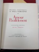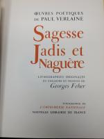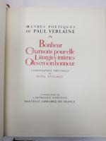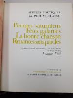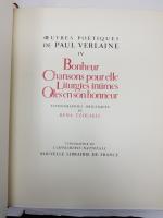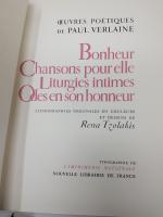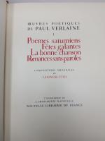 VERLAINE (Paul) - OEuvres poétiques : Tome 1 : Poëmes saturniens, Fêtes galantes, La bonne chanson, Romances sans paroles compositions originales en couleurs et dessins de Léonor FINI ; Tome 2 : Sagesse, Jadis et naguère, lithographies originales en couleurs et dessins de Georges FEHER ; Tome 3 : Amour, Parallèlement, lithographies originales en couleurs et dessins de Michel TERRASSE. Tome 4 : Bonheur, Chansons pour elle, Liturgies intimes, Odes en son honneur, lithographies originales en couleurs et dessins de Rena TZOLAKIS ; exemplaire numéroté, Paris, Imprimerie Nationale, 1967-1968, 4 volumes in-4 de 203, pages, reliés demi-maroquin à coins, têtes dorées, dos lisses à nerfs