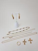 Lot composé d'1 alliance, 1 giletière, 2 croix, 1 paire de boucles, 3 chaînes dont 1 cassée or 750° poids 35,9g