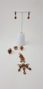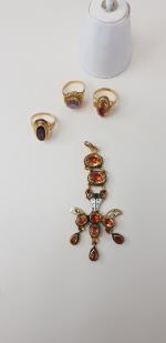Paire de boucles, 3 bagues TDD49/50 et 1 pendentif articulé avec émail le tout avec pierres or 750° poids brut 30,9g
