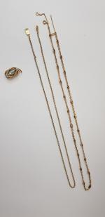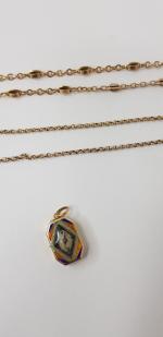 Collier avec chaînette de sécurité 54cm env, chaîne 52cm env et 1 pendentif boitier de montre à restaurer or 750° poids brut 28,7g