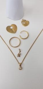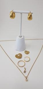Lot 1 paire de créoles, 1 alliance TDD63, 1 chaine 56cm env , 1 bague coupée avec pierres,4 pendentifs dont 1 avec diamant et 1 avec pierres et 1 avec anneau manquant or 750° poids brut 17,4g