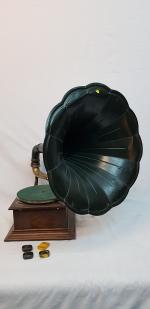 Phonographe à pavillon en bois, fonte et tôle - Début XXème - H.67 x L. 31 x P. 32 cm - (état d'usage et socle à refixer)