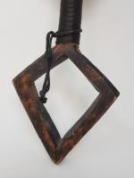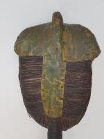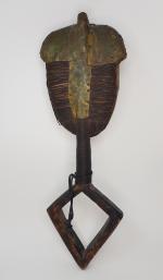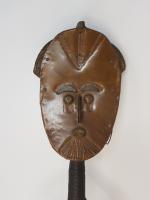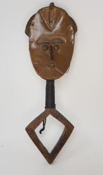 Figure de reliquaire en bois à patine brune de facture originale - Les yeux ronds rapportés en métal, motif de chevelure, sourcils et barbe (?) en pointillés repoussé dans la feuille de cuivre plaquée et agrafée sur le recto - Au verso, un fin décor complexe de fils de cuivre est appliqué parallèlement, le cou est entièrement recouvert de fils de cuivre, le piétement en forme de losange - Peuple Kota, Gabon - H. 48 cm - (accident au piètement)