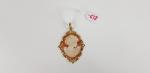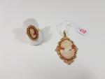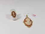 Lot composé : d'une bague en or jaune 750e ornée d'un camée sur coquillage et d'un pendentif - TDD 59 - Dim. plateau : 21x14mm - Dim. pendentif : 42.9x32.6mm - Poids brut total : 9g80
