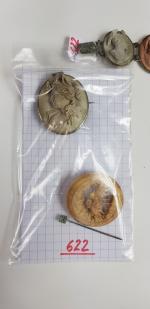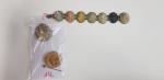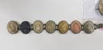 Lot composé : d'un bracelet articulé en métal argenté (ou argent bas titre ?) composé de 7 médaillons ornés de camées en plâtre et pierres de lave - d'une broche métal argenté et camée pierre de lave et d'une broche en ivoirine - (accidents, oxydation...) - en l'état