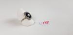 Bague en platine et or gris ornée en son centre en serti-clos d'un diamant 1/2 taille de 0.12ct environ dans un entourage rayonnant de saphir de synthèse calibrés et diamants taillés en rose - époque vers 1920 - TDD : 56 - Dim. plateau : 17x12mm - Poids brut : 3g20