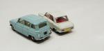 DINKY FRANCE, 2 modèles : réf 510 Peugeot 204 berline beige B.o, réf 518 Renault 4L bleu ciel C.o
