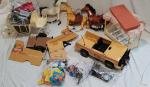 MATTEL BARBIE, un ensemble sur le thême de l'équitation comprenant une calèche attelée à deux chevaux, à remonter (pièces et harnais fournis avec), une Jeep avec remorque-van à restaurer, avec son cheval beige - on y joint un lit à baldaquin et un lot de vêtements