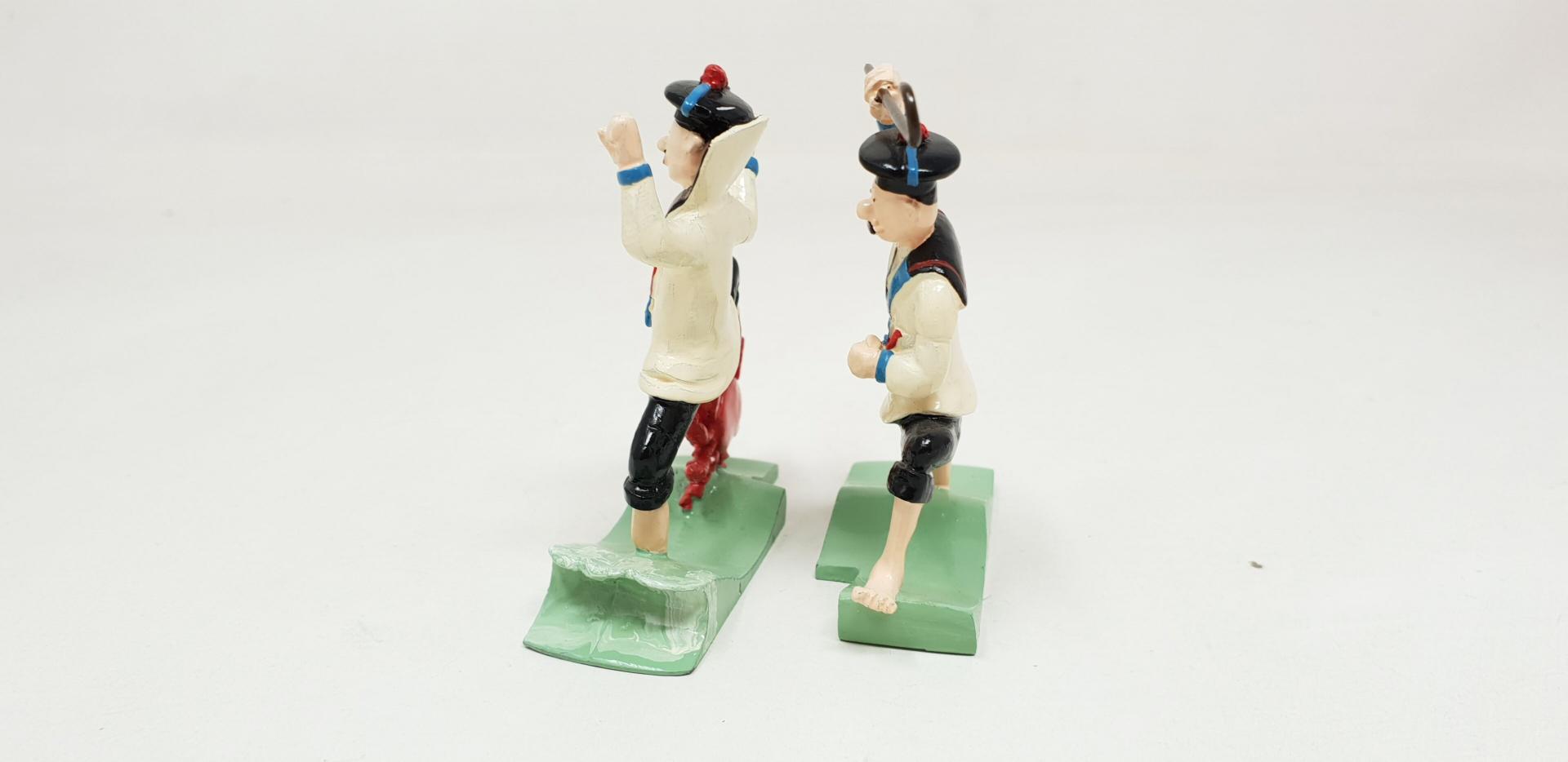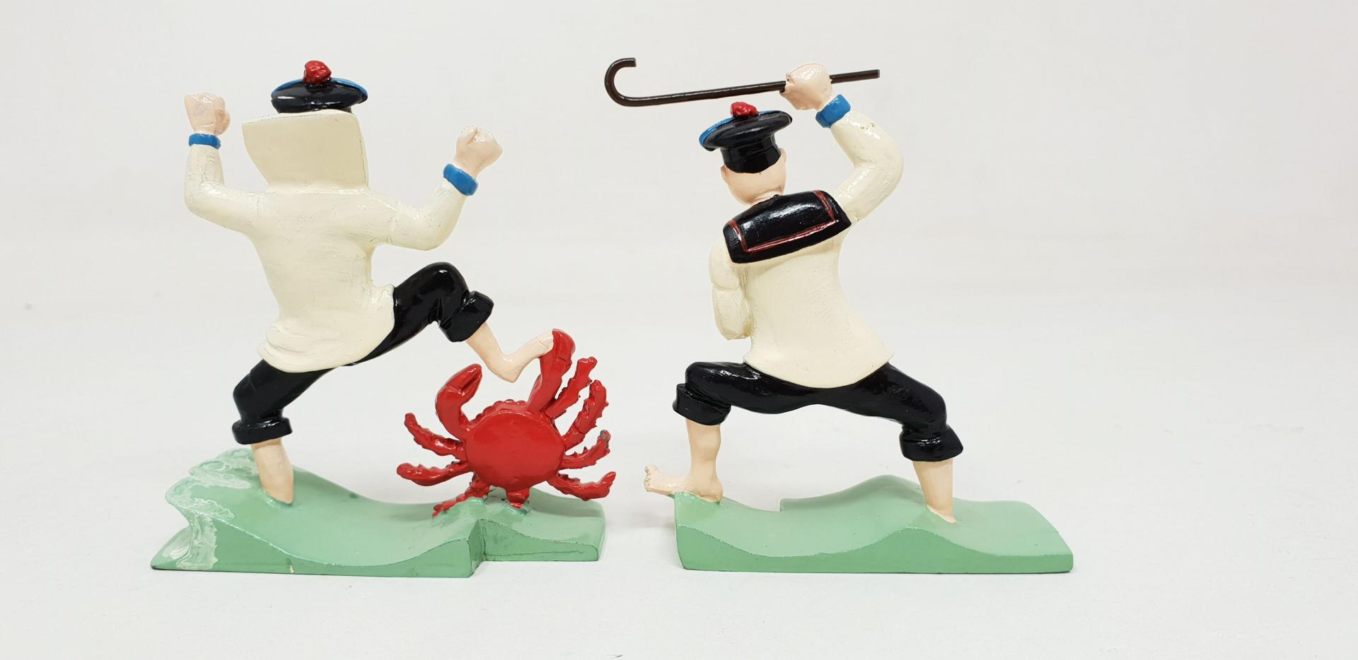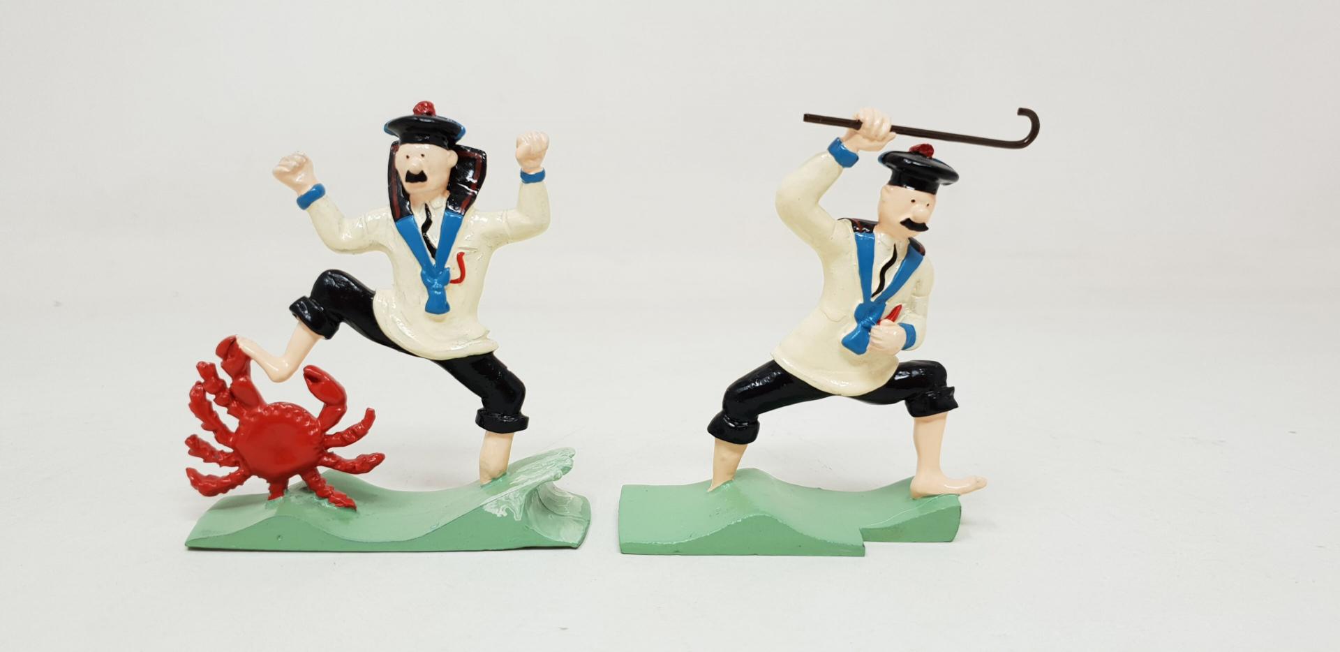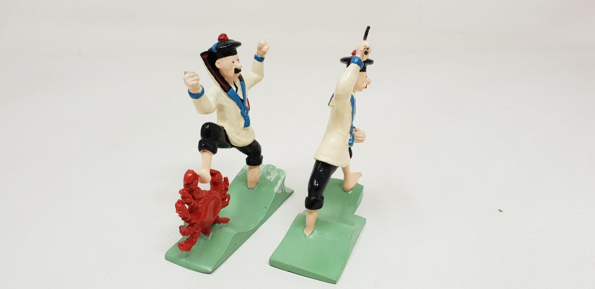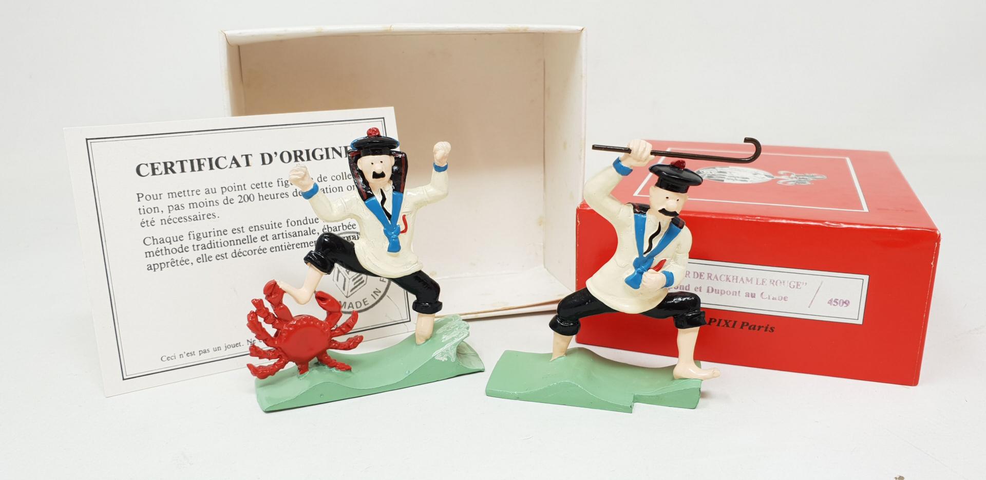 PIXI (Paris, plomb peint, 1990) réf 4509, série LE TRÉSOR DE RACKHAM LE ROUGE, deux figurines "Dupond et Dupont au crabe", H : 6.7 cm avec boîte et certificat non numéroté (rousseurs sur le fond de boîte)