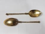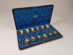 Douze cuillères à café en vermeil, manche russe à décor de plumes sur le cuilleron - Poinçon tête de sanglier - Poids : 142,9 g - en coffret - (bon état d'usage)
