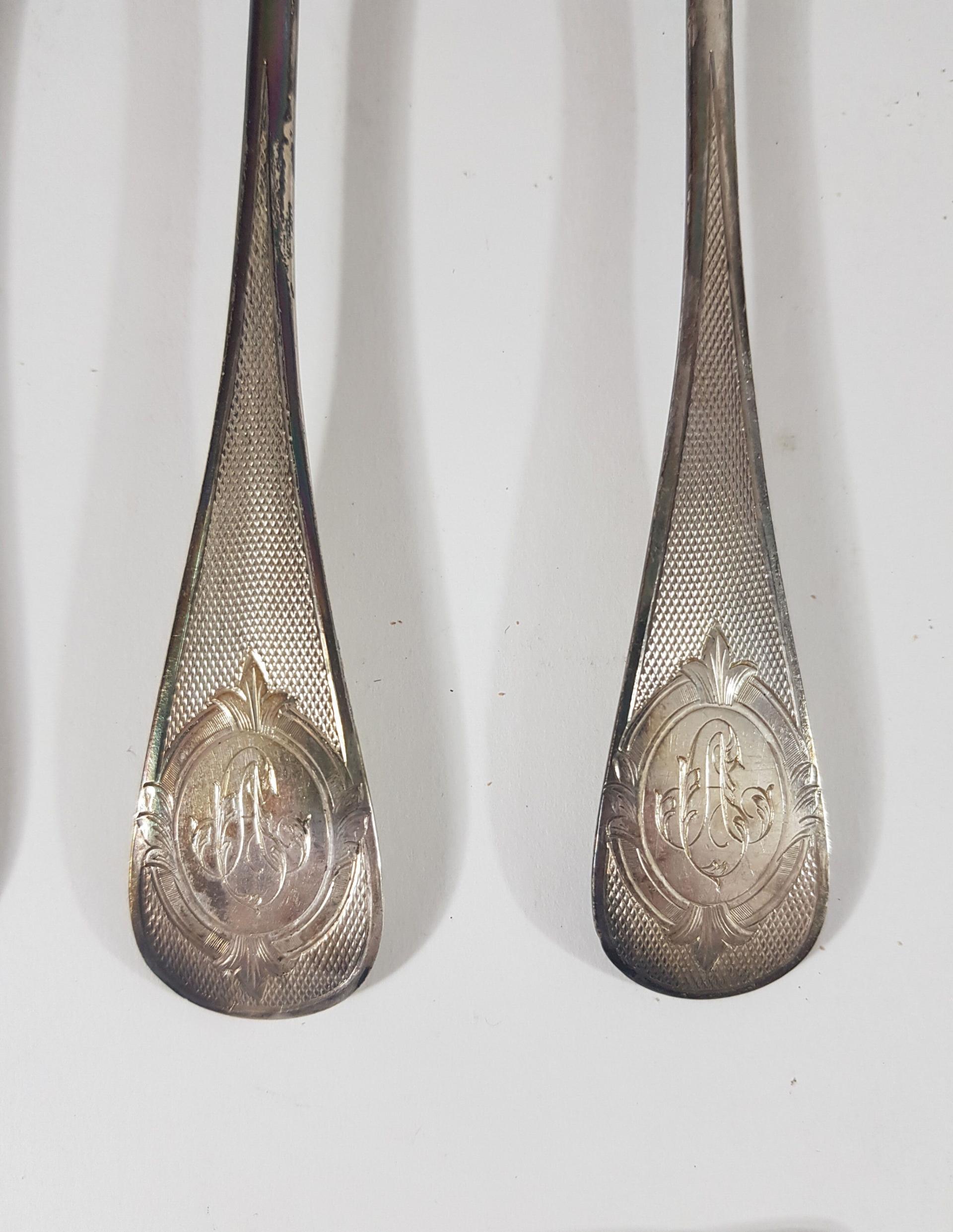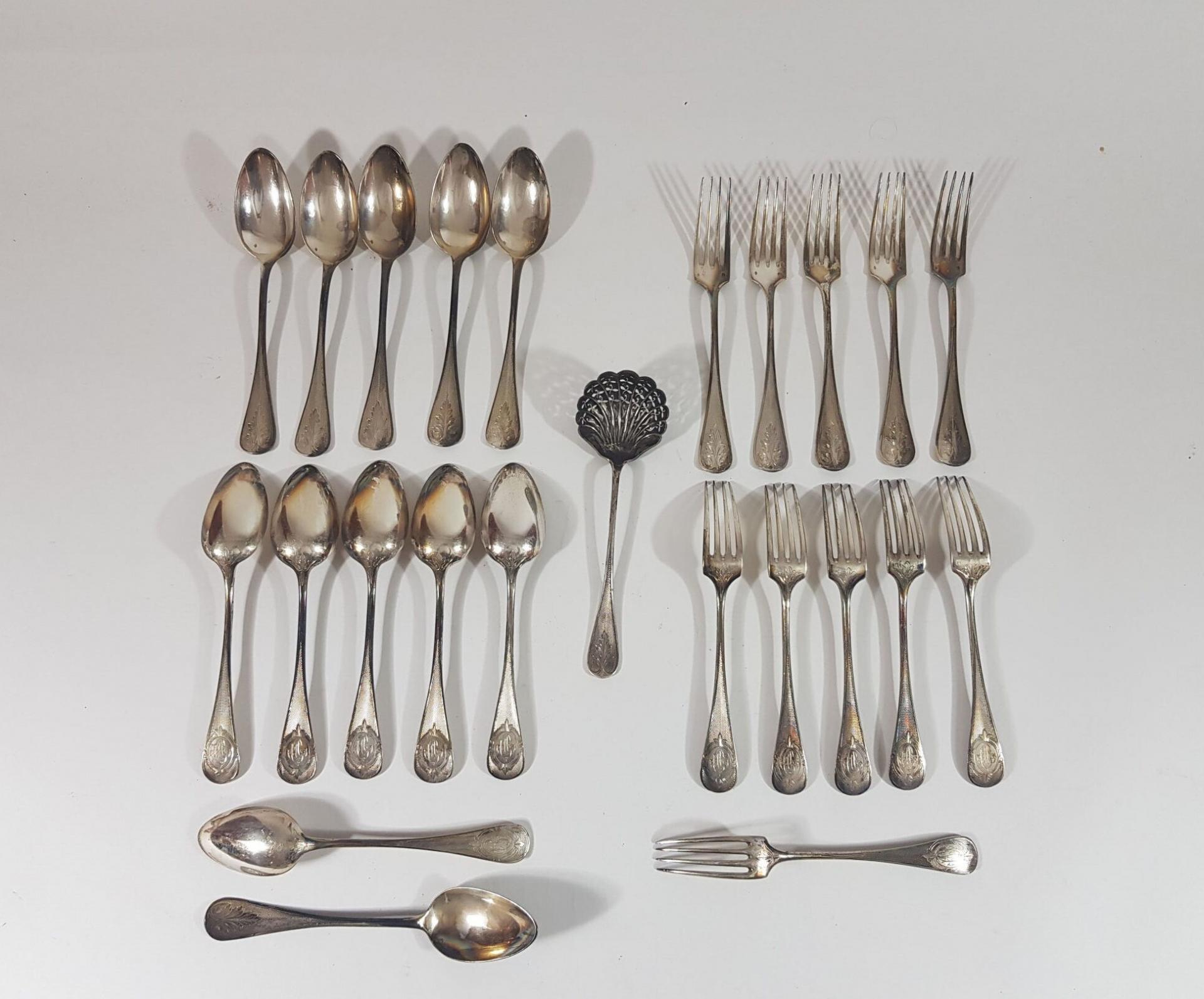 Ensemble de onze couverts, une cuillère de table et une cuillère à saupoudrer en argent, monogrammés AC en médaillon sur fond amati - Maître orfèvre : CARON - Poinçon Minerve - XIXème - Poids : 1811 g - (état d'usage)