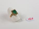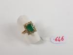 Bague en or jaune 750e ornée d'une émeraude taillée à pans coupés (9x6.6x3mm) dans un entourage de diamants et de pierres blanches - TDD 49 - Poids brut : 4g70