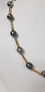 Collier ras de cou en or jaune 750e - maille bâtonnets - alternée de perles de culture grises de Tahiti (diam. 8.4 à 9mm environ) - L. 42cm - Poids brut : 21g70 - parfait état - dans son écrin