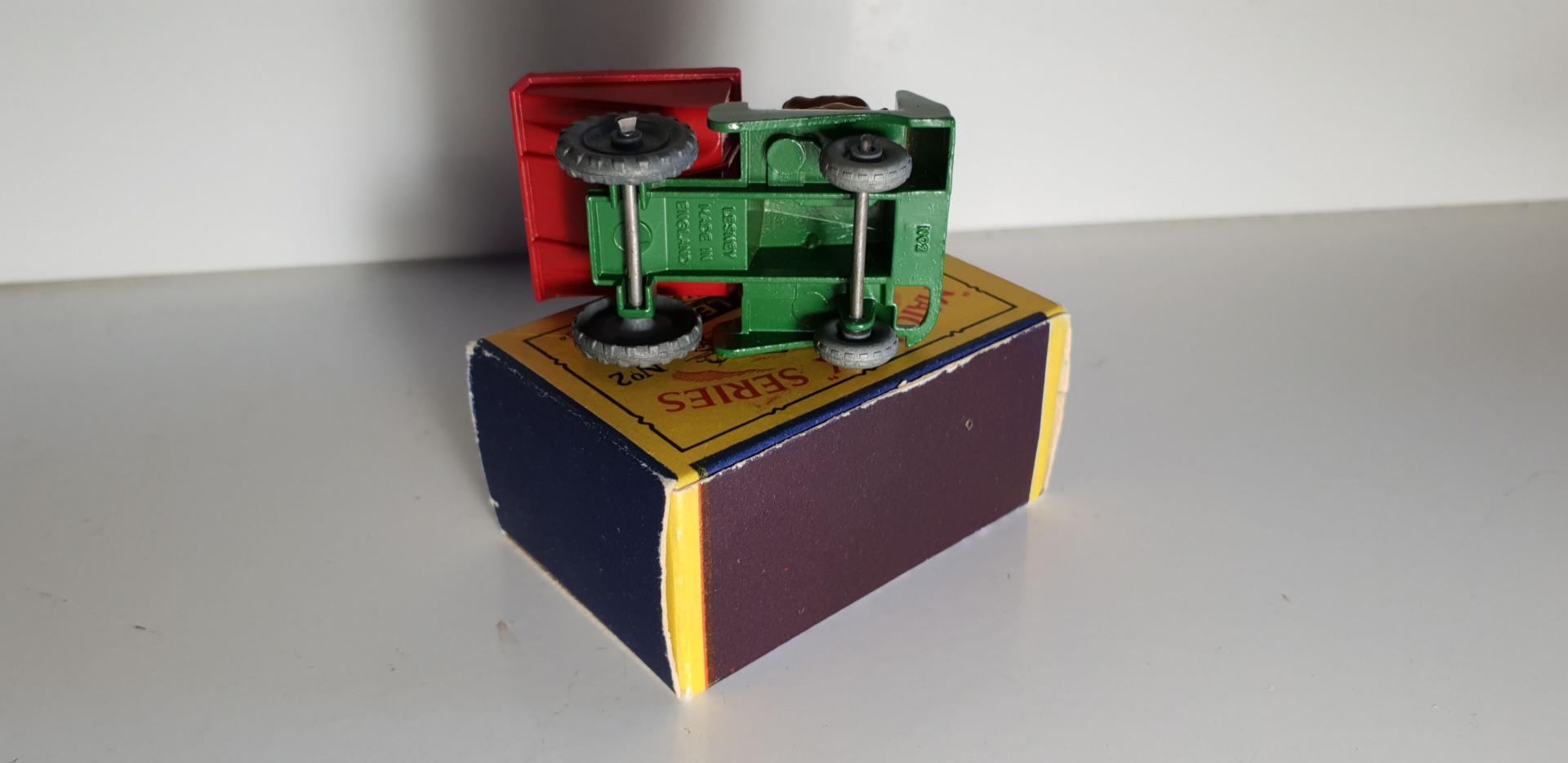 LESNEY-MATCHBOX réf 2b1 dumper vert/rouge, roues zamac, L : 4,7 cm, boite 1c, état A.b+