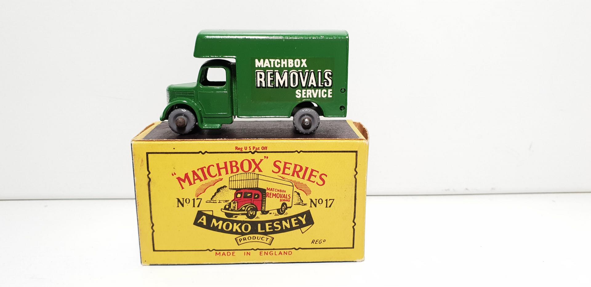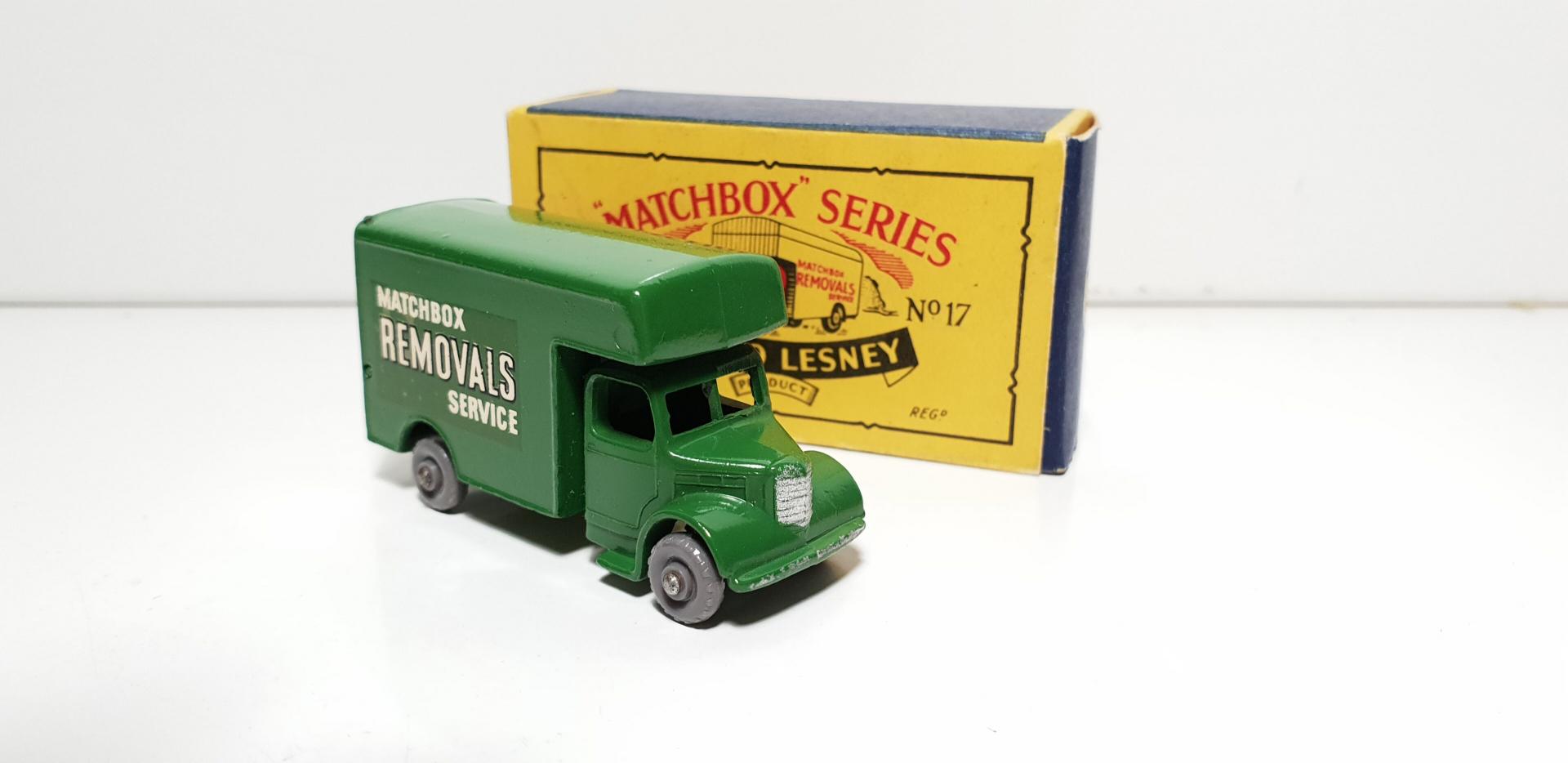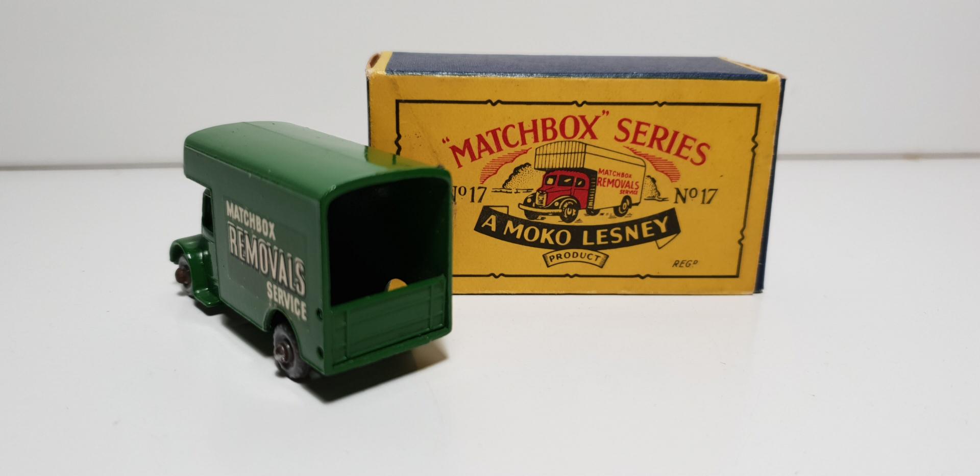 LESNEY MATCHBOX réf 17a5 Bedford MATCHBOX REMOVALS SERVICE, VERT SOUTENU, roues plastique gris, axes bouterollés, lettres REMOVALS avec contour noir, boite 1g, A.b