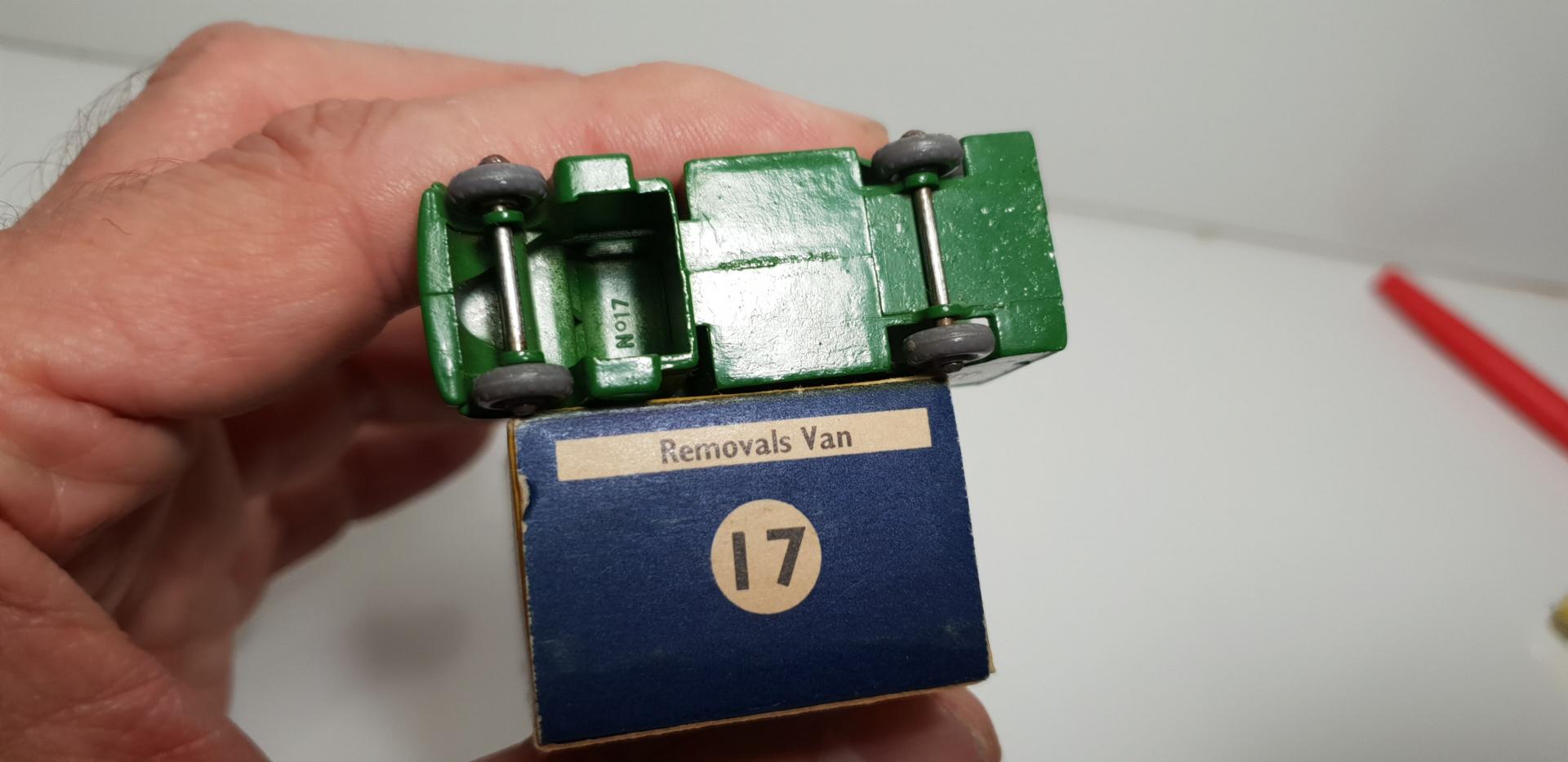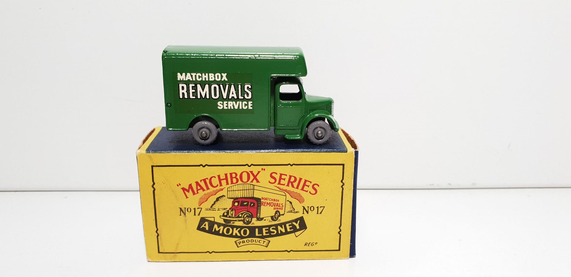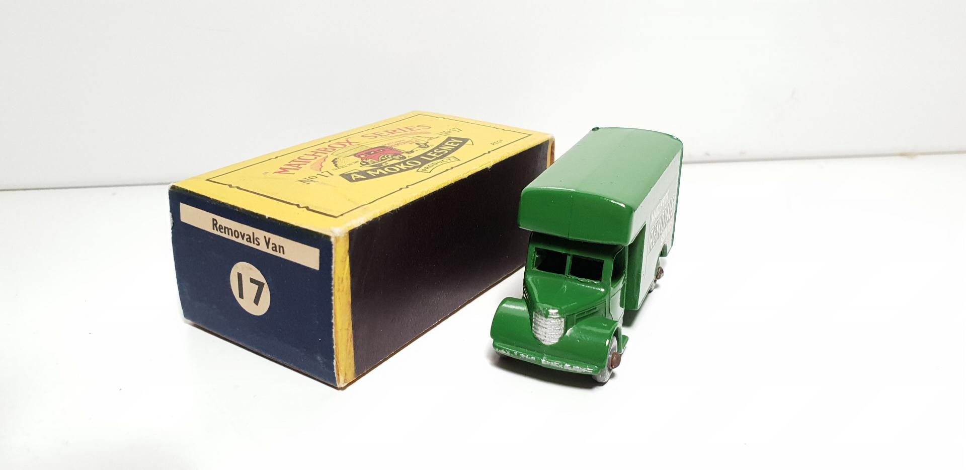 LESNEY MATCHBOX réf 17a5 Bedford MATCHBOX REMOVALS SERVICE, VERT SOUTENU, roues plastique gris, axes bouterollés, lettres REMOVALS avec contour noir, boite 1g, A.b
