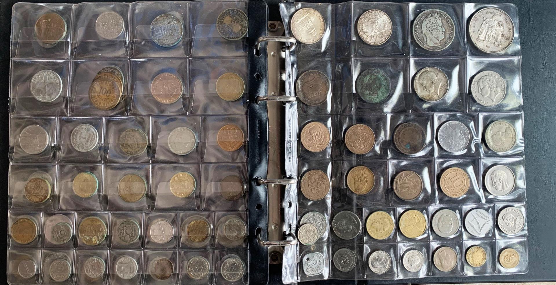 Un classeur comprenant 3 pages de monnaies, quelques argent, états divers
