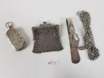 Lot composé : d'une bourse cotte de maille en argent - d'un clavier avec chaine jaseron en argent - d'un porte-pièces en métal argenté - Poids argent : 57g70 - Poinçons : sanglier et minerve
