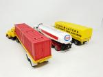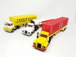 CORGI TOYS , 3 camions semi-remorques : Mack R citerne ESSO A.o, Mack R porte-conteneurs CTI jaune/rouge A.o, Scammell Ferry Master jaune/blanc A.o