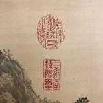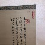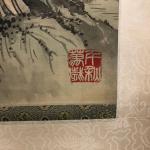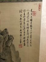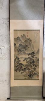 Kakemono - Peinture polychrome sur soie à décor de paysage lacustre et idéogrammes - XXème - 174 x 59 cm en tout