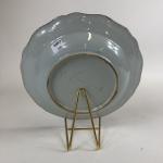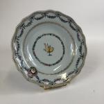 Assiette creuse en porcelaine à décor central d'attributs et de guirlandes fleuries et de cornes d'appel dans un médaillon sur l'aile - Chine, Compagnie des Indes, XVIIIème - Diam. 24 cm - (fêle étoilé sur le fond)