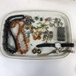 Lot de bijoux fantaisie comprenant deux colliers en bois et pierre dures, paire de clips d'oreilles ZOE COSTE en métal argenté, boucles d'oreilles, montre pour homme LOTUS et bracelet - (états divers)