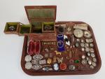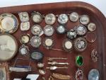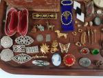 * Lot de broches, pendentifs, boucles d'oreilles, cadres photo, éventail et un coffret à bijoux - états divers
