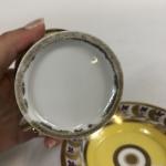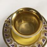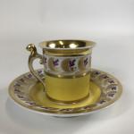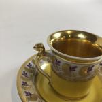 Tasse et sa sous-tasse à décor de fleurettes et branchages dorés sur fond jaune, anse en forme de chimère - Paris, XIXème - H. 8,5 x Diam. 13 cm