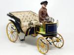 JOUET PINARD (attribué à, vers 1900) voiture Krieger en tôle peinte bleu foncé/filets jaune, et fer soudé, L : 37cm, moteur à ressort, capote en moleskine doublée de soie repliable par compas latéraux, sièges en soie capitonnée, avec chauffeur à tête de porcelaine attribuée à F.Gauthier (tête recollée) - très bel état d’origine, pneus arrière remplacés - la marque parisienne Krieger était spécialisée dans les taxis électriques entre 1897 et 1909 - complet de son carton d’époque 44 x 23,5 x H 23cm (usures et restaurations au carton) portant l’étiquette « Au Paradis des Enfants, 1 rue du Louvre, Paris »
