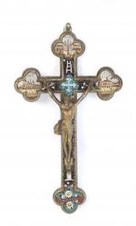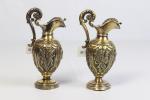 Paire burettes en vermeil poinçon minerve 1er titre dont l'une à décor de pampres de vignes et profil du Christ en médaillon et l'autre à décor de roseaux et profil de la Vierge en médaillon. H : 16 cm. Poids 297g.