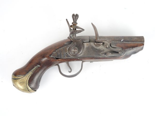 106-13-Petit pistolet de poche à silex mi XVIIIème. Platine à silex, corps de platine plat, bassinet fer rond, chien col de cygne, mécanisme à revoir, pontet fer, calotte bronze, composite, raccourci. (2)