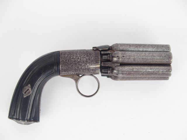 281-Petite et superbe poivrière Mariette, arme très finement gravée, dotée d’un faisceau de 6 canons démontables à balle forcée en damas numérotés de 1 à 6 (Epreuve Belge), détente à anneaux, mécanisme à échappement, belle monture renaissance en ébène strié. (1) . Arme de catégorie « D »2 .vente libre sous condition de majorité.(87)