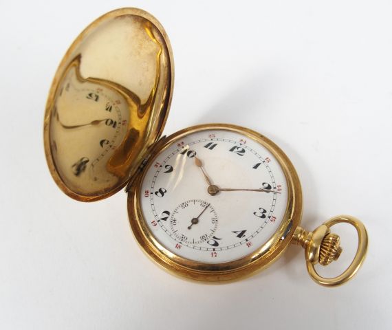 Montre savonnette en or jaune en or jaune, cadran émail, chiffres arabes, chronomètre. Diam. : 50mm Poids tel : 81,2gr