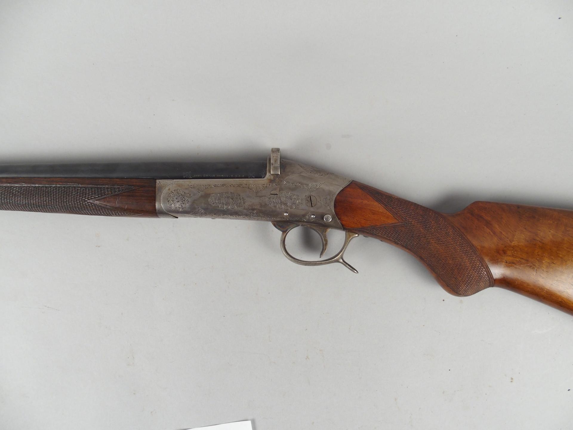 Fusil mono-canon basculant " Simplex " de la manufacture d'armes de Saint-Etienne. Calibre 16/70. Canon de 700mm de longueur et crosse demi-pistolet de 355mm de longueur. Fines gravures. Brettelle automatique de crosse. (1). Catégorie D1