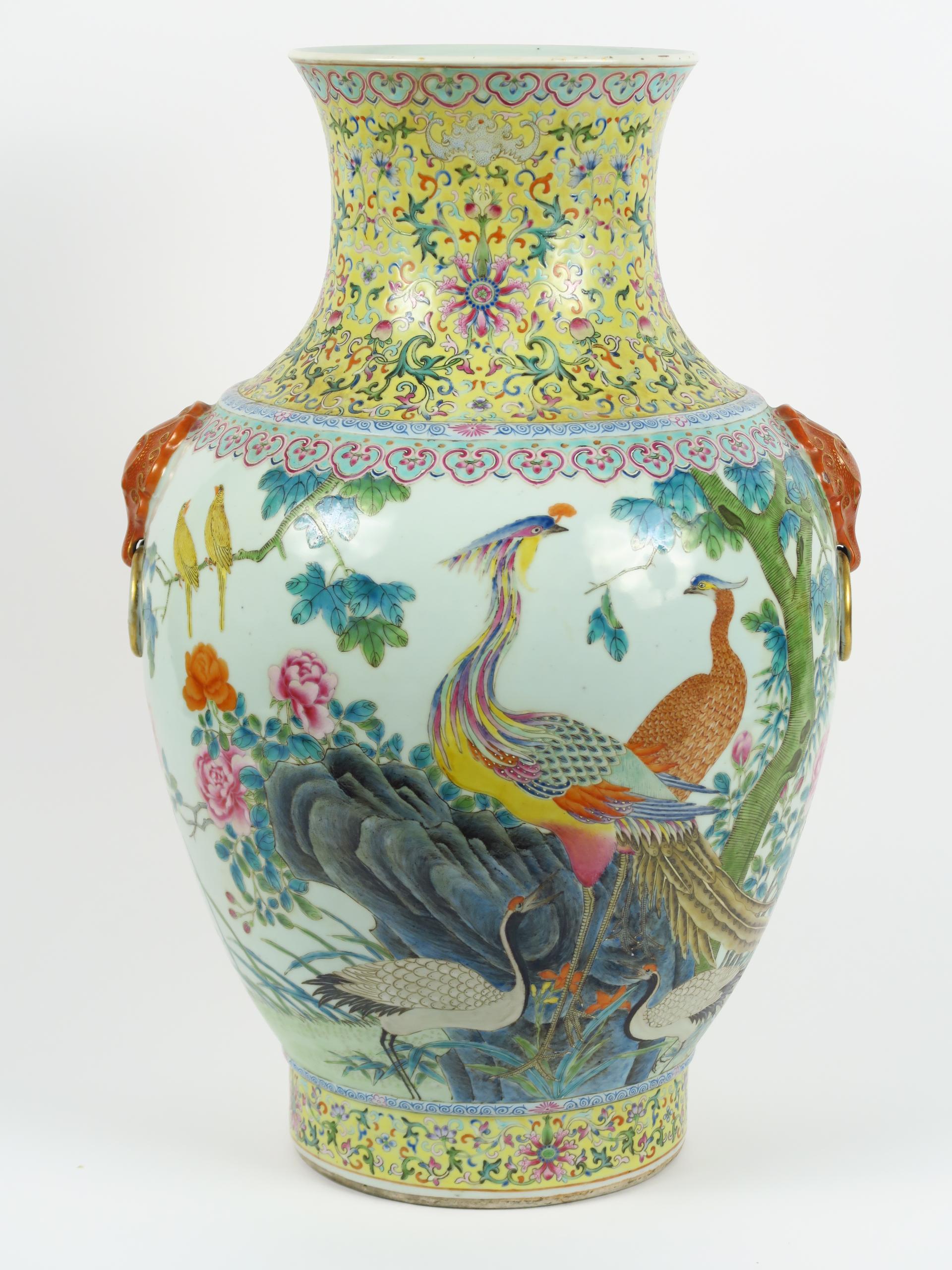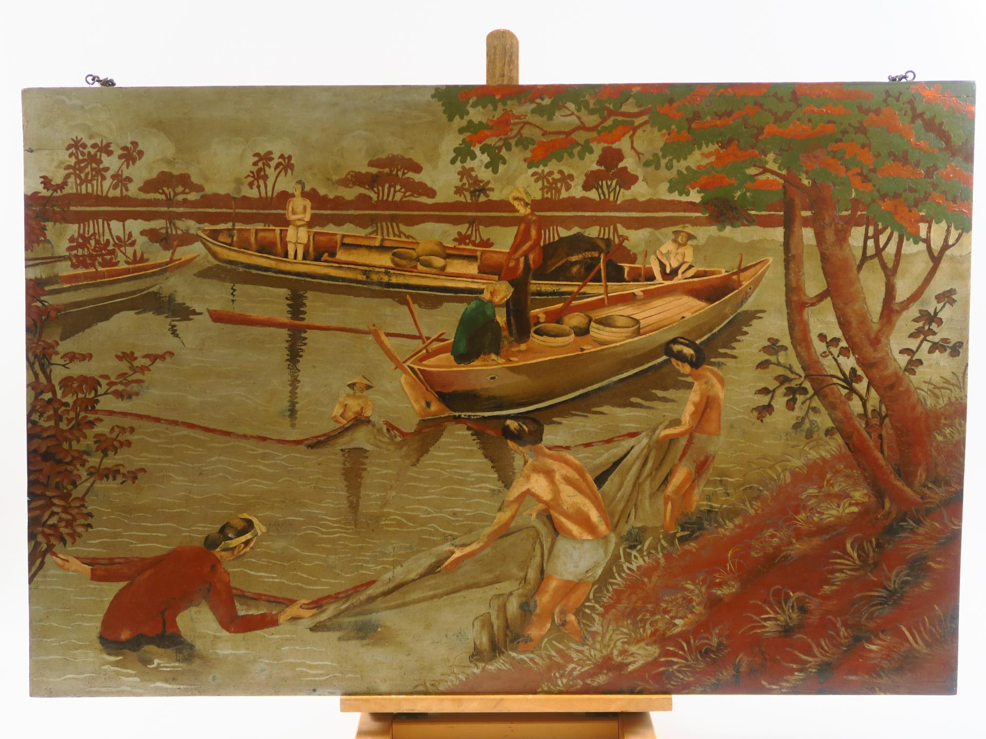 Belle composition en laque polychrome sur panneau, représentant des pêcheurs, certains relevant leurs filets dans l'eau, parmi des embarcations, sous un flamboyant.