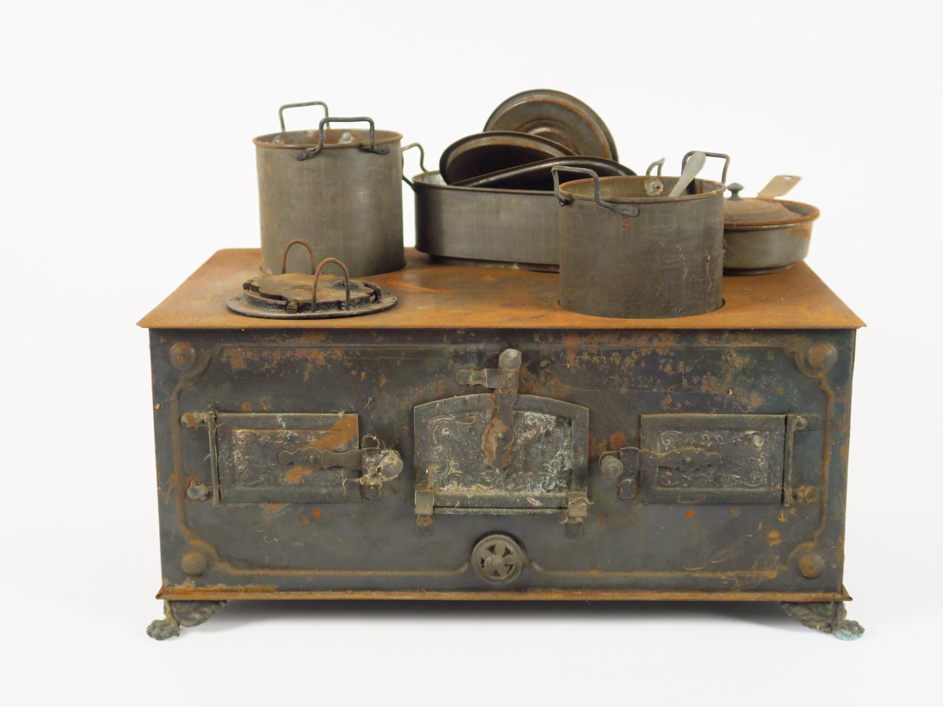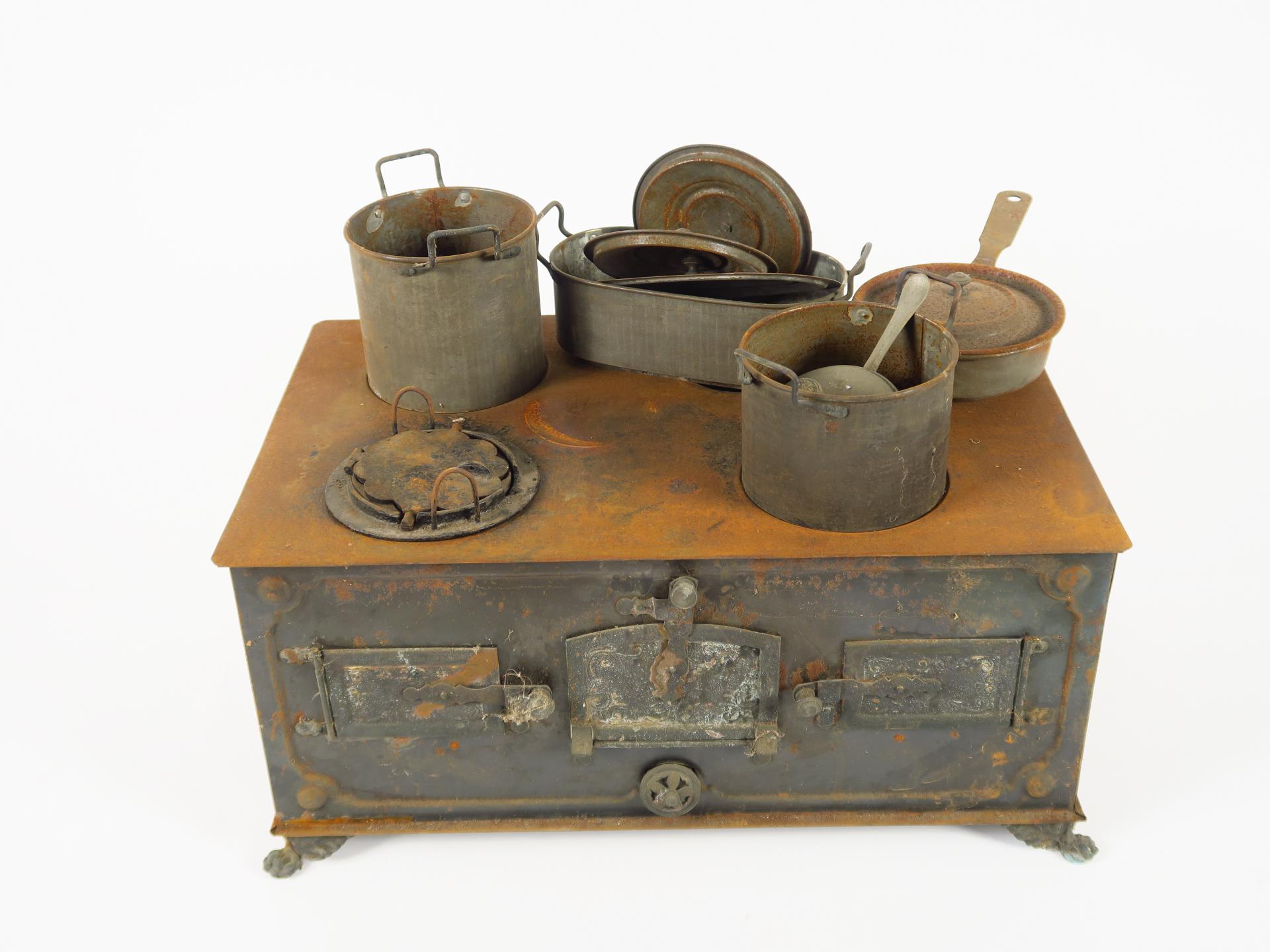 Très belle cuisinière en t&le XIXème avec casserole et éléments (manque la cheminée). Dim. 40 x 25 cm