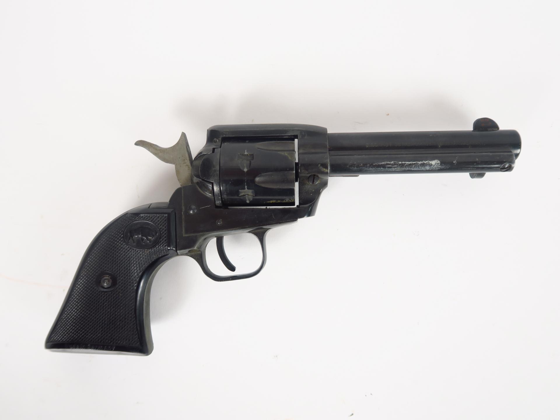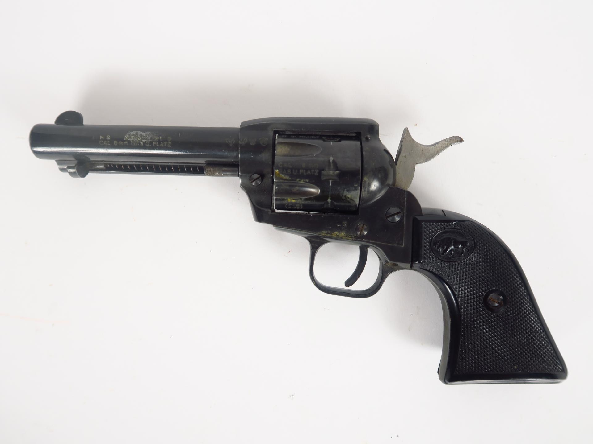 Copie d'un revolver SAA 1873 Colt par la société Schmidt, calibre 8 mm à gaz et à blanc, carcasse dural anodisée, barillet et canon acier. Plaquettes en bakélite avec bison. Arme de catégorie D.(1)