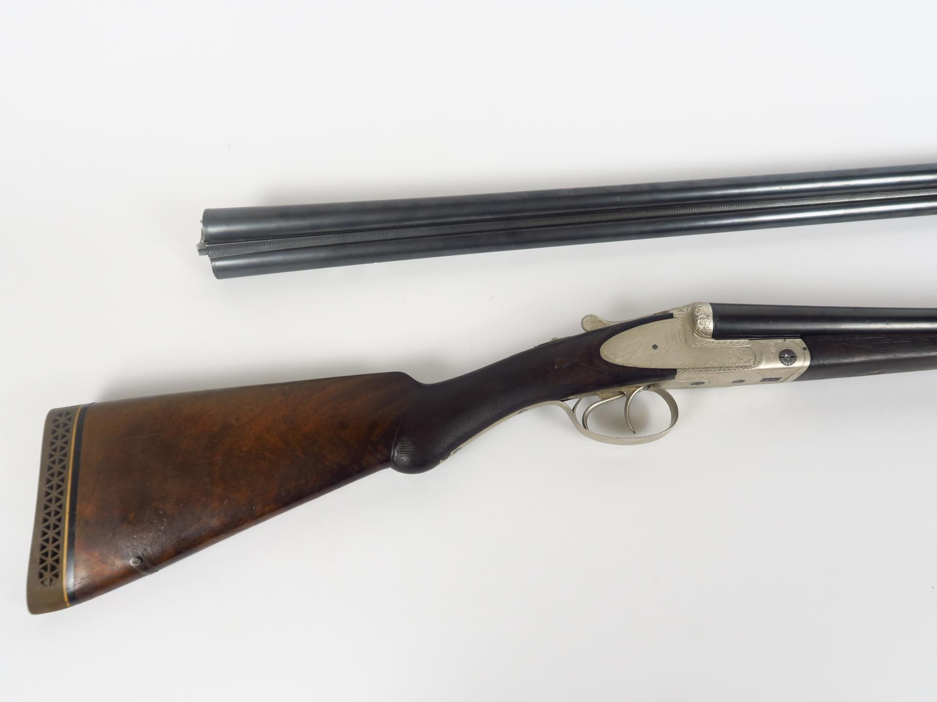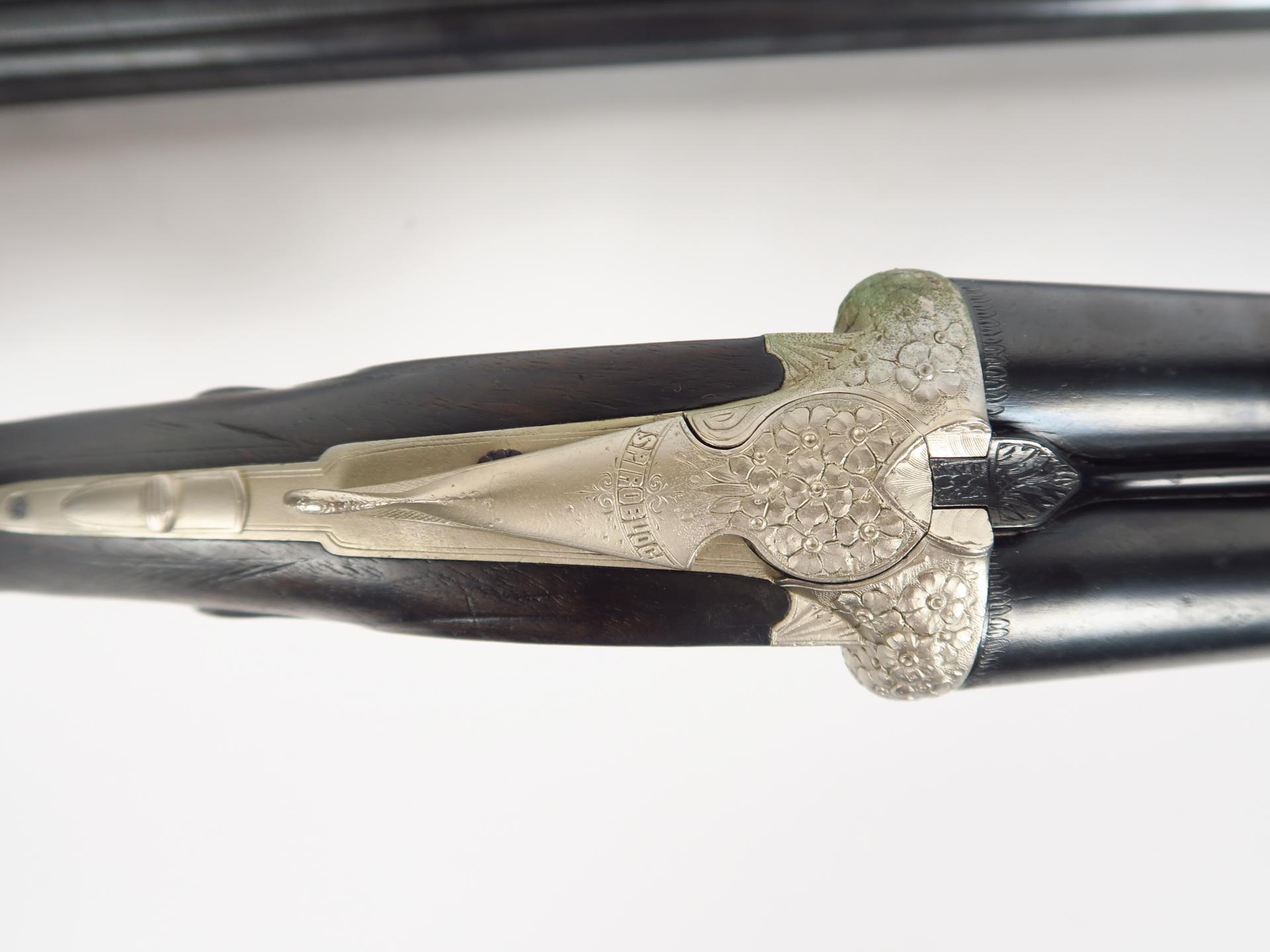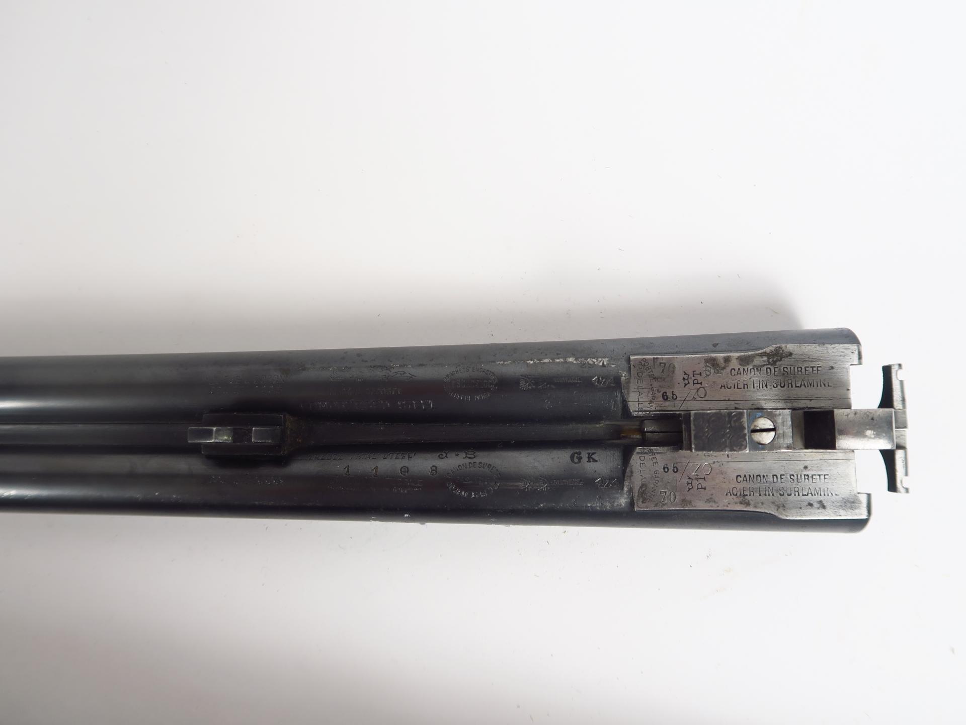 Joli fusil juxtaposé à coffre systéme Anson & Delay "spirobloc" calibre 16/70 numéro 1108. fusil à éjecteurs à marteaux et contre platines, bascule et garnie trempe grise à décor de bouquets de roses sculptés sur les pistons et la clef,canard à l'envol et setter sur un corps de platine, cerf au brame sur l'autre. Vis bleues (restauration Alain Ruffinoni Toulouse). Devant grande pompe, crosse 1/2 pistolet de 378 mm de long avec bretelle à enrouleur et plaque de couche en caoutchouc.L'ame est ici proposée avec deux jeux de canons (680 mm et 660 mm) alésages d'origine. Cale unique sur les deux canons triple vérouillage avec un vérrou sur le prolongement de bande, pas de jeu. Arme de catégorie C. (1)