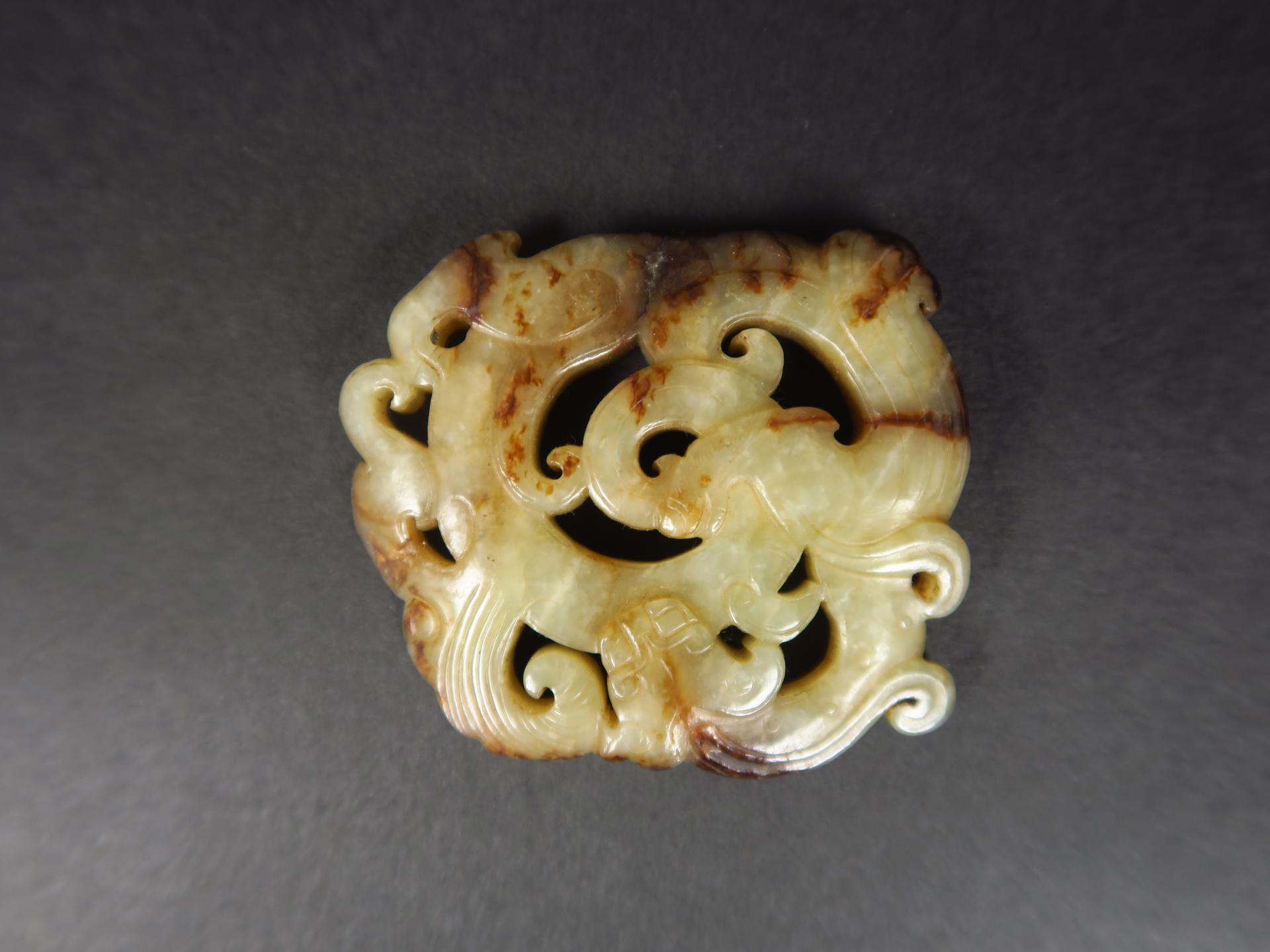 Pendentif en jade jaune représentant un dragon lové. Chine, XVIIIème siècle. Long. 6 cm