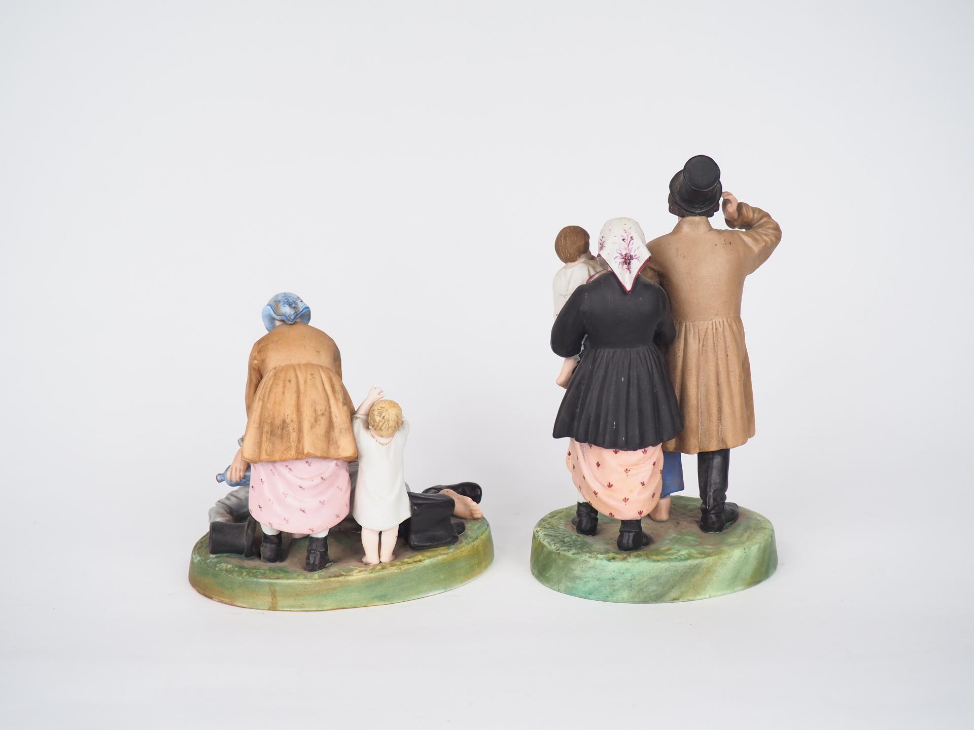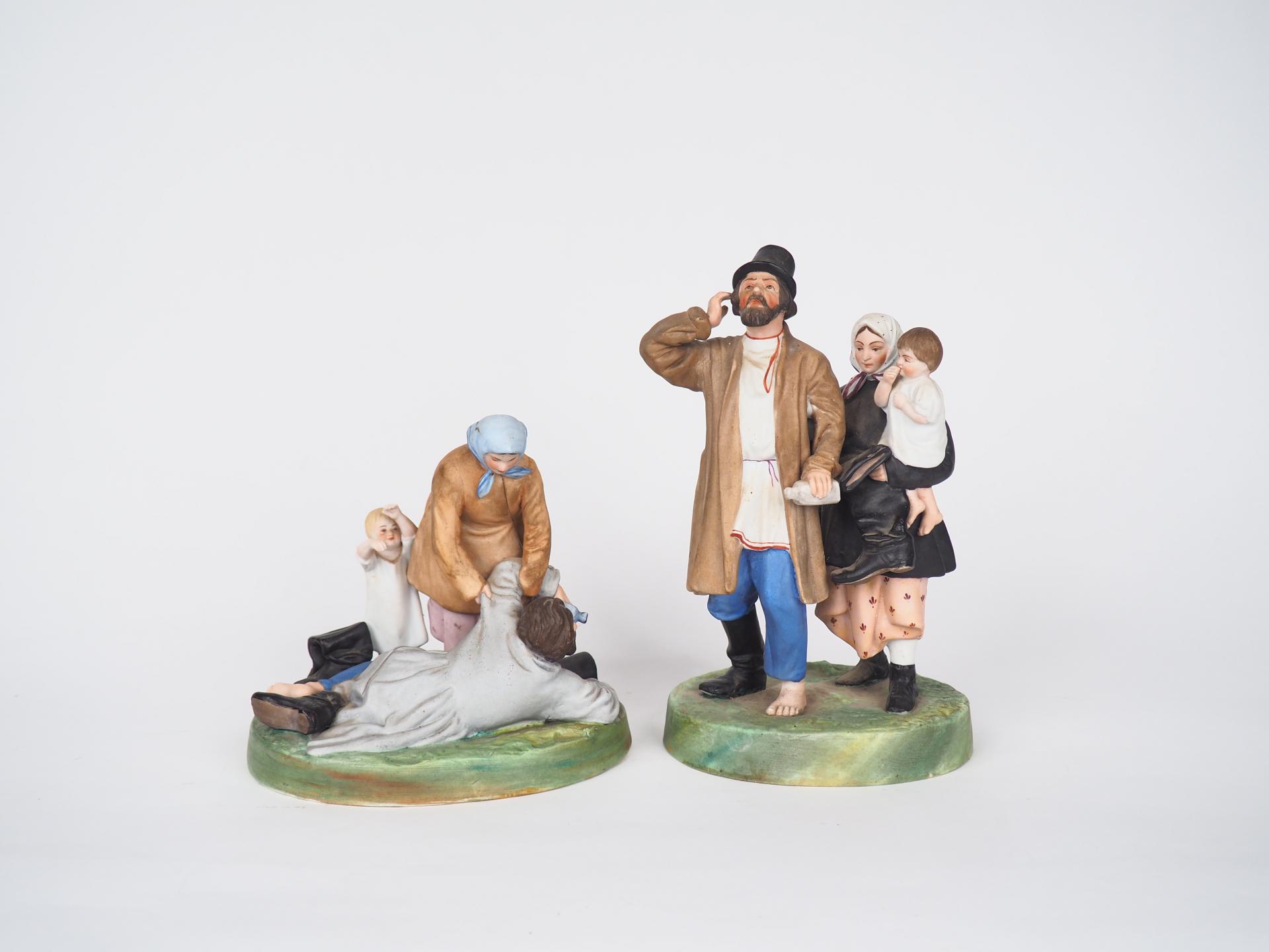Deux différents groupes en biscuit polychrome représentant les scènes de la vie russe. H. 25 et 17 cm