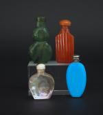4 différents flacons à sels en pierre dure, nacre, opaline et jadéite.