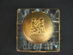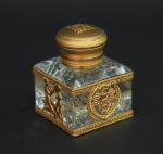 Encrier 1900 de style Empire en cristal et laiton doré à décor de cornes d'abondance et de femmes à l'antique. H. 8,5 cm.