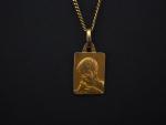 Chaine en or jaune, maille gourmette, ornée d'une médaille en or jaune figurant un jeune garcon à la colombe.