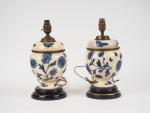 Paire de lampes Napoléon III en faience fine figurant des potiches couvertes à décor en camaieu bleu, de fleurs et d'insectes, pied circulaire en céramique noire à l'imitation du marbre