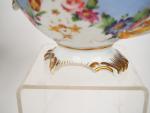 Service à thé Napoléon III en porcelaine de Paris, à décor de fleurs polychromes sur fond bleu ciel et blanc rehaussé d'or, comprenant : deux théières, un sucrier, un pot à lait ou à eau, une coupe à biscuits, 12 tasses et sous tasses.