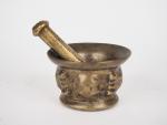 Mortier et son pilon XVIIème en bronze. Dim. du mortier : 8 x 12 cm L. du pilon : 14 cm