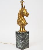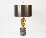 Maison CHARLES. Lampe en bronze doré, t&le et marbre vert, à décor de cheval. H. 69 cm